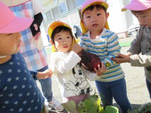 ・さつまいもの素材そのものに触れる機会が少ないので、どのように大きくなるか、どんな形かを見せてあげたいと思いました。予想以上に大きくなったサツマイモをみて嬉しそう。