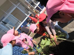 よし!!ひっぱるよー!とみんなでひっぱってもなかなか抜けず、近くにいた年中さんもお手伝いしてくれました。