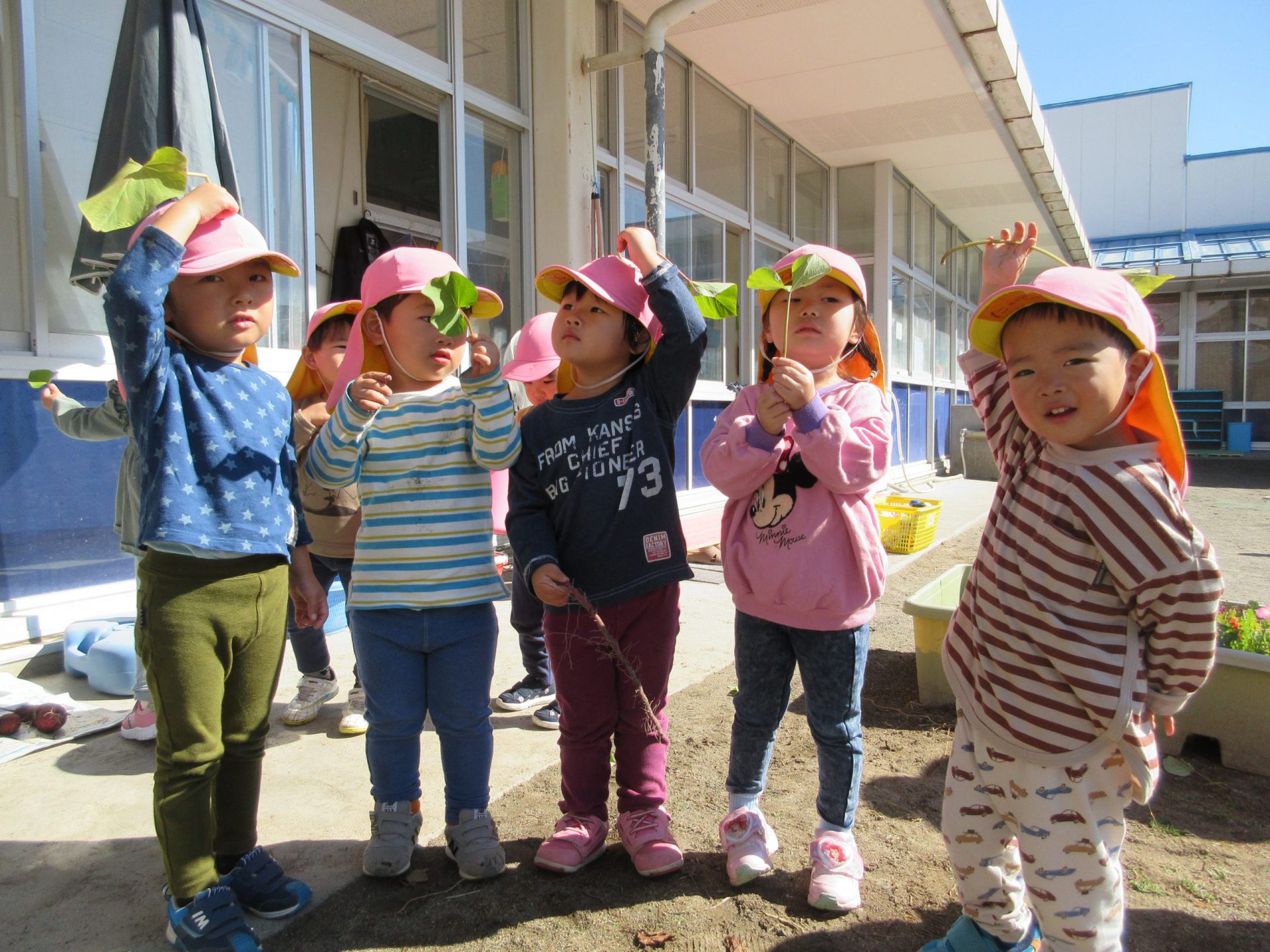 ・さつまいもの葉を頭に乗せて「トトロみたーい!」茎の匂いをかいで「くさーい!!(笑)」