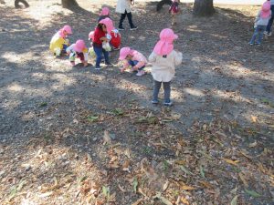 後日、綱島神社へ散歩に行き、製作に使うどんぐり・葉っぱ・枝を集めてきました。