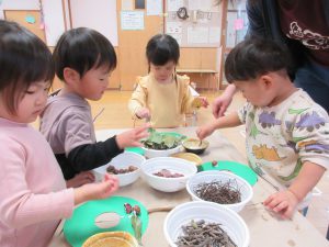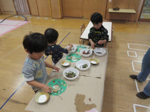 「ここにぎゅっぎゅってするんだよ」などと話しながら楽しく作っています。