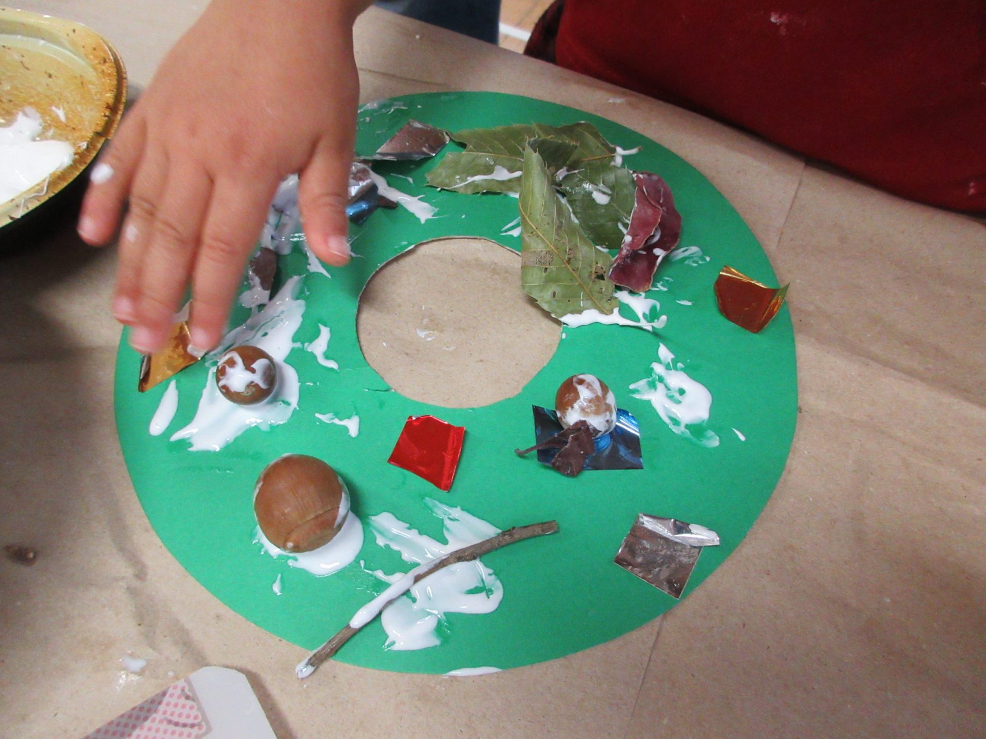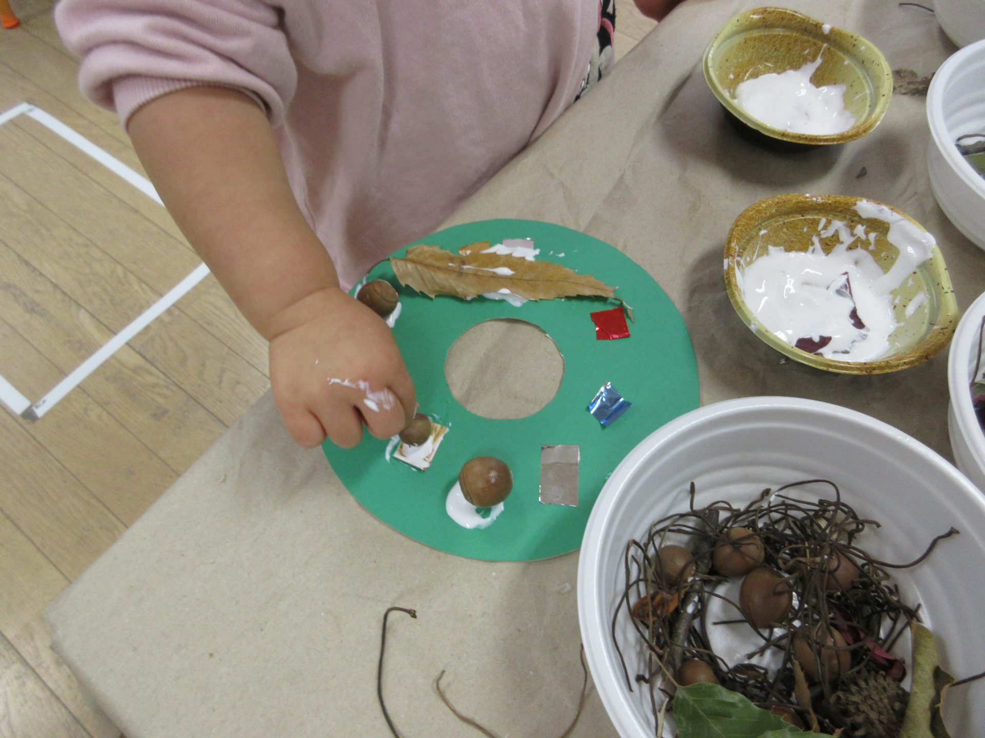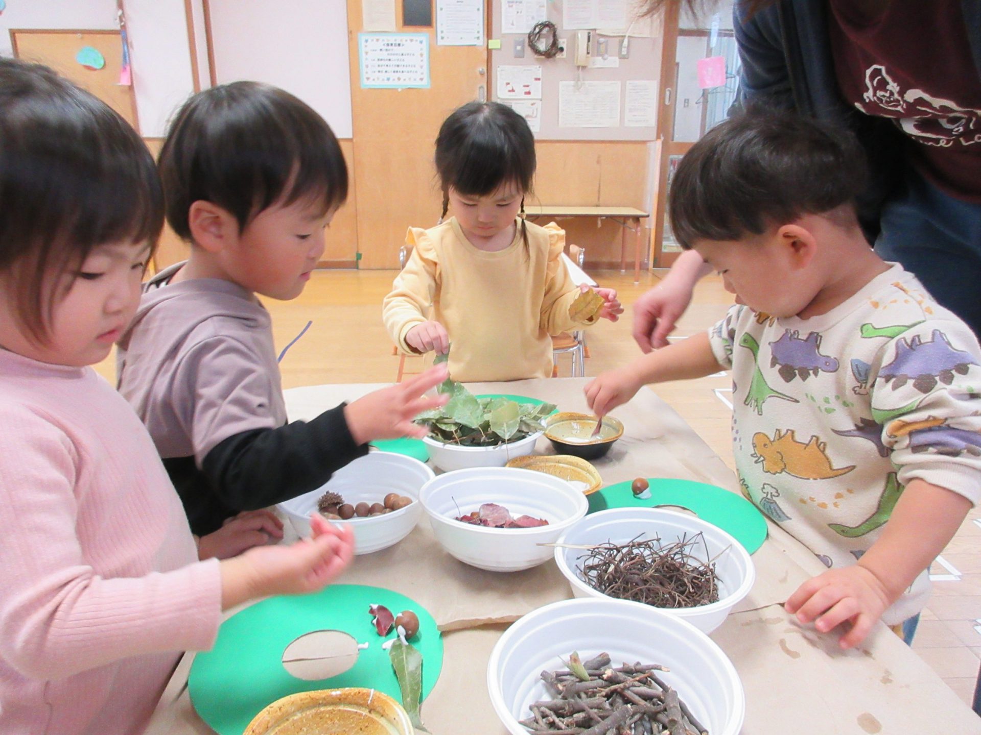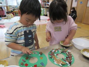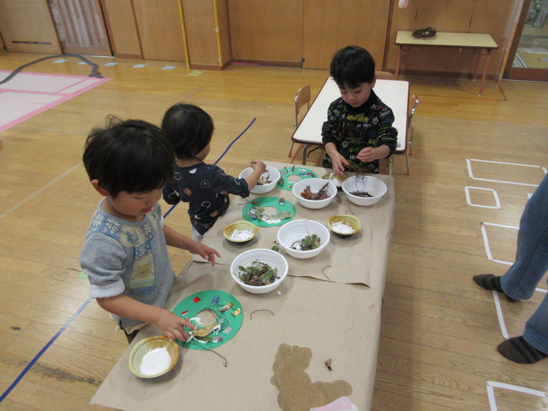 ・自分たちで集めてきた自然物を使うことで製作への意欲も増して、予想を超える真剣さに成長を感じました。いろんな素材、形があることで子どもたちのイメージも広がりすてきなリースが出来ました。残った素材を使って、また違った遊びを考えていきたいと思います。