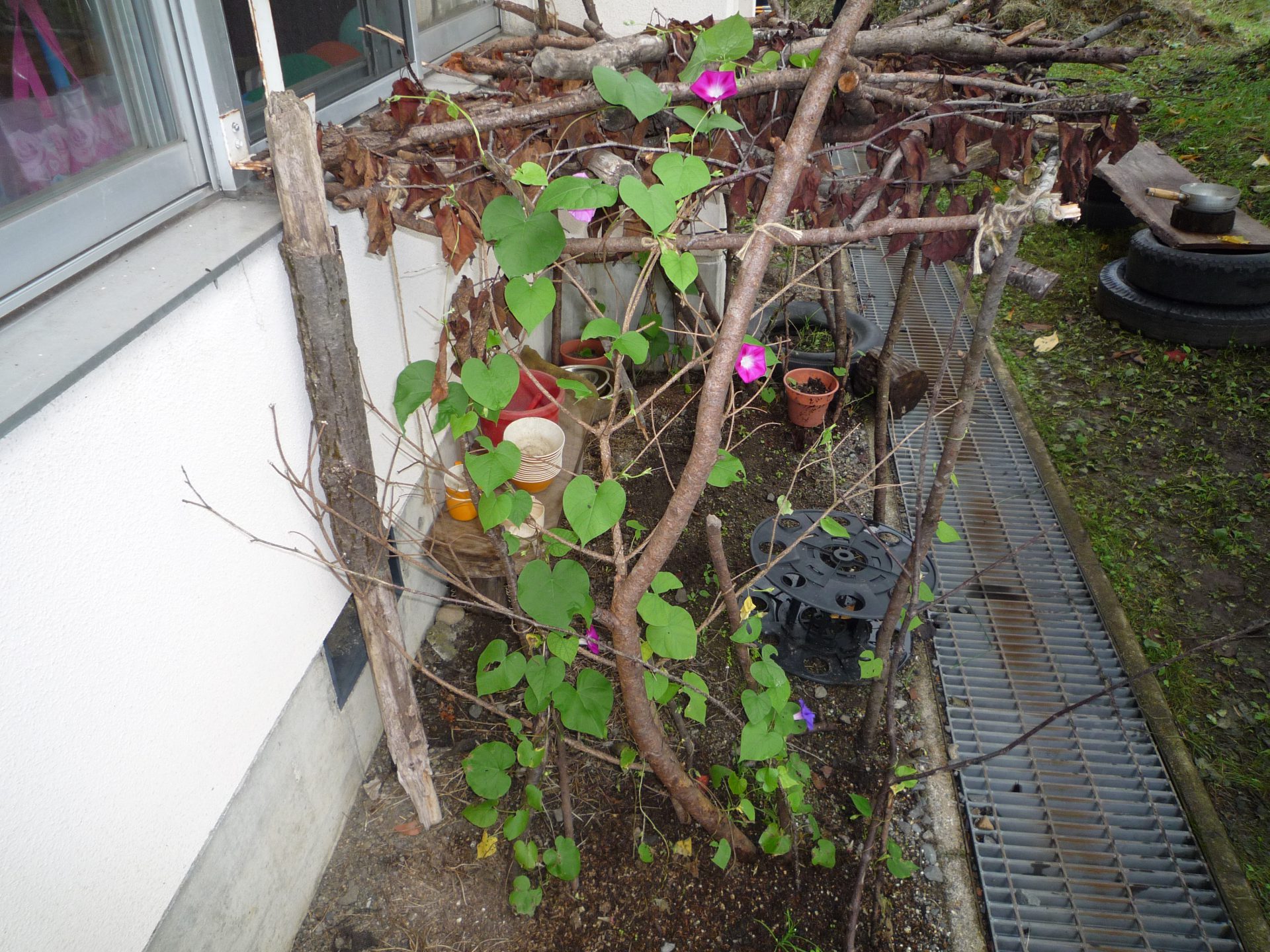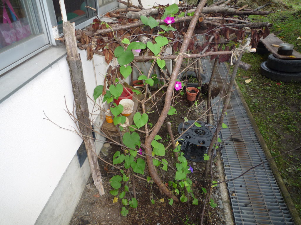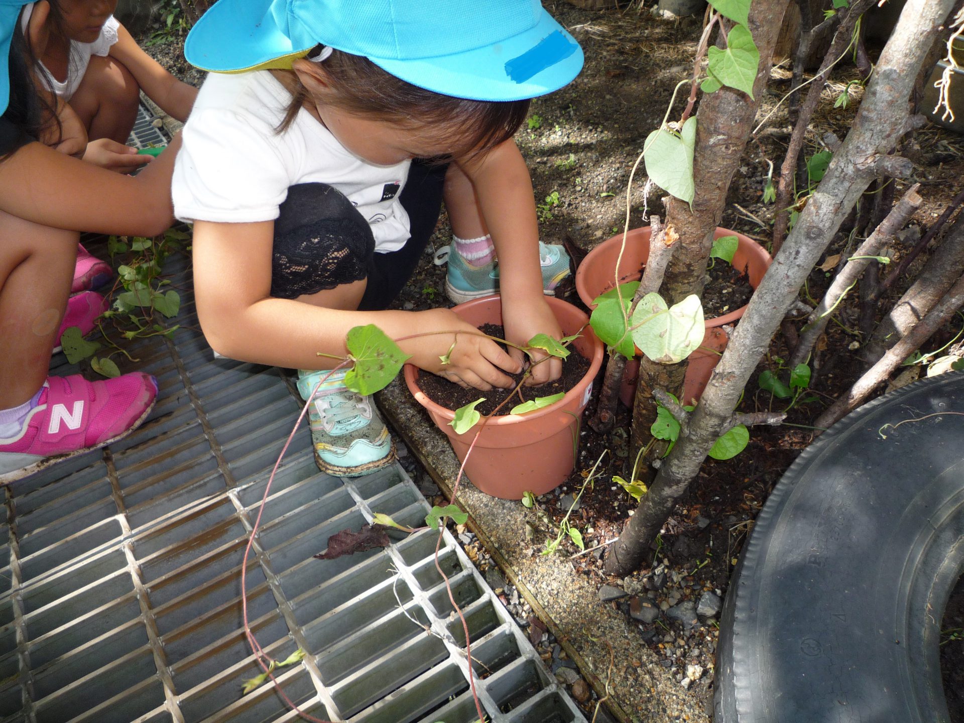 時々、地面に生えているあさがおを見つけるとシャベルで掘ってはっぱのおうちに植えています。