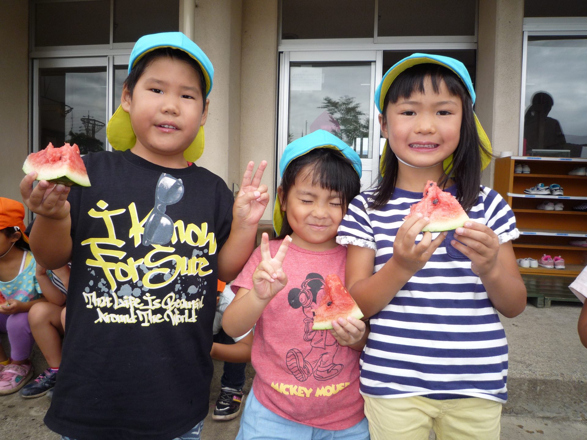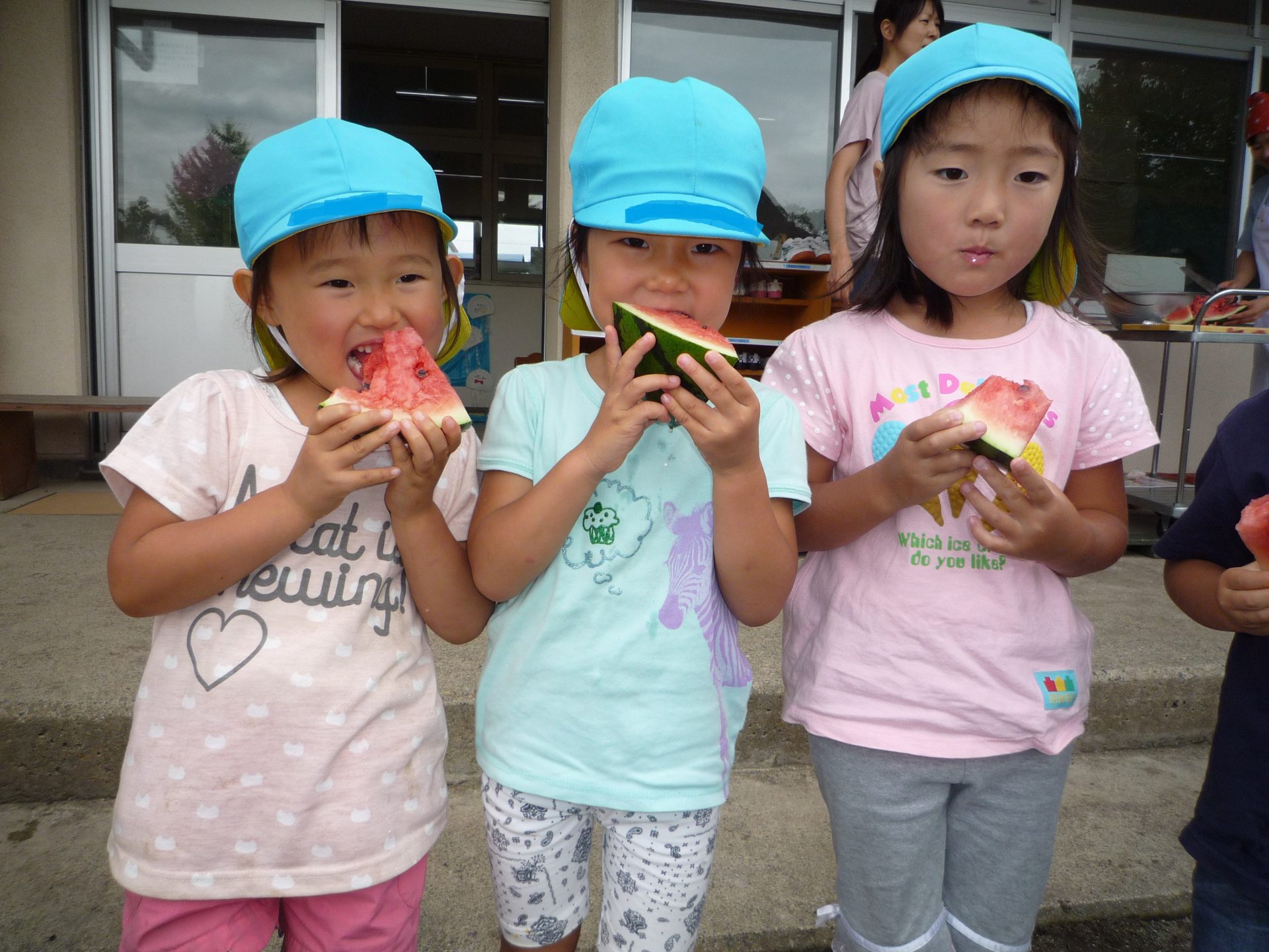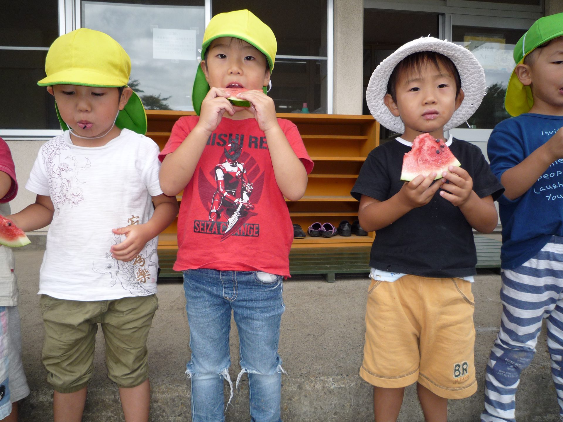 汗をかいた後の水分補給に5才児が畑で育てたすいかをわけてもらいました。