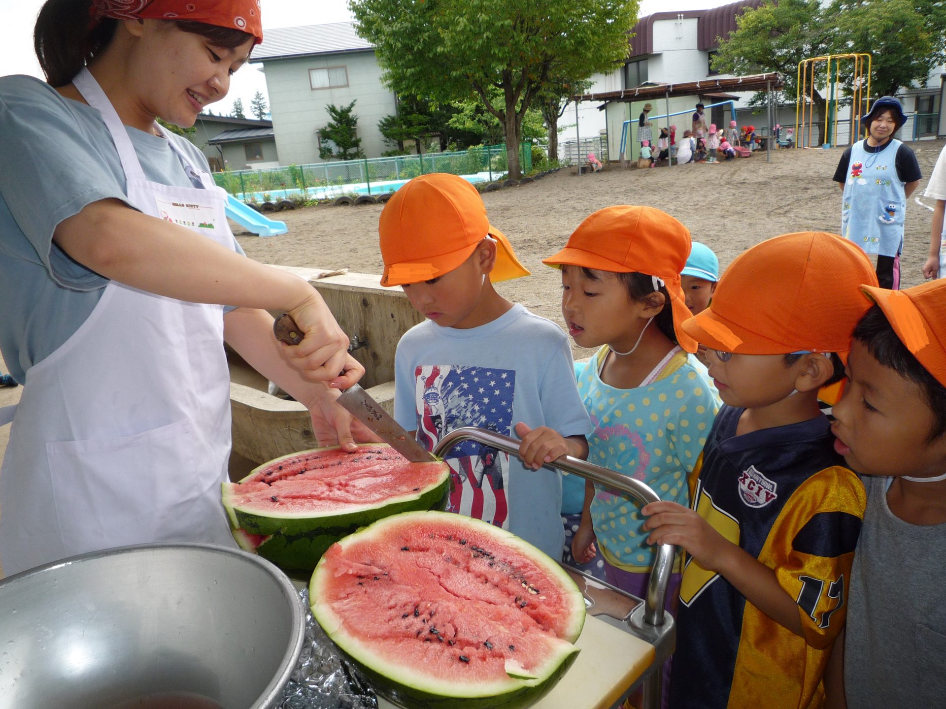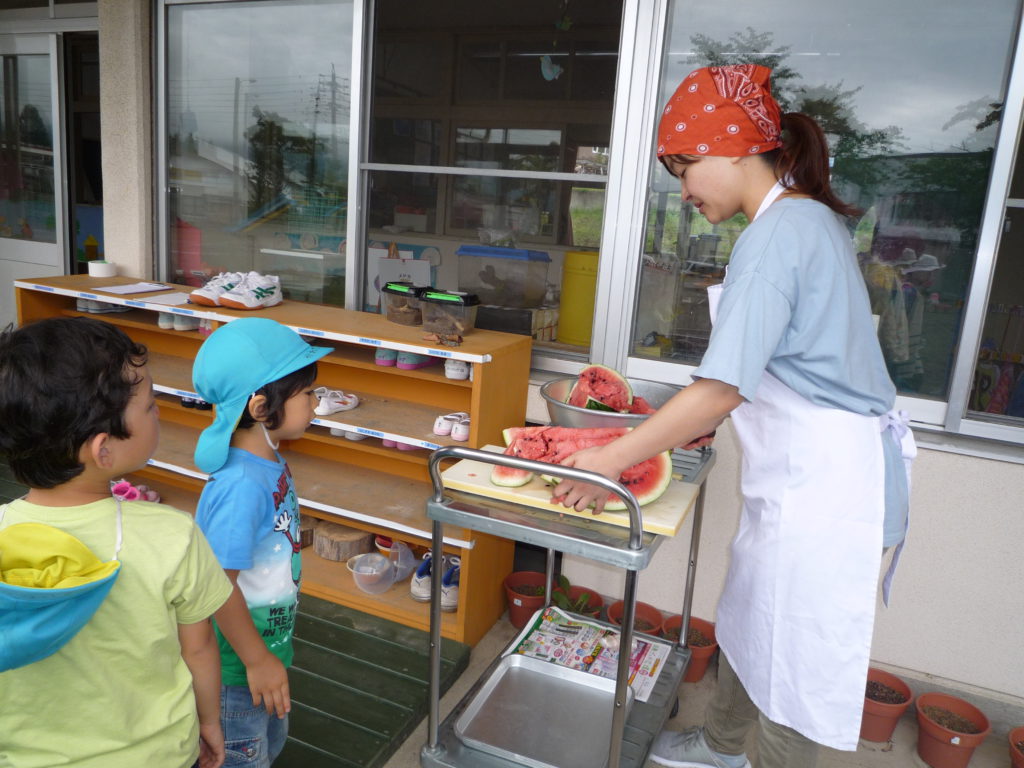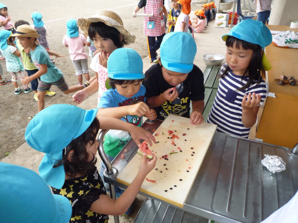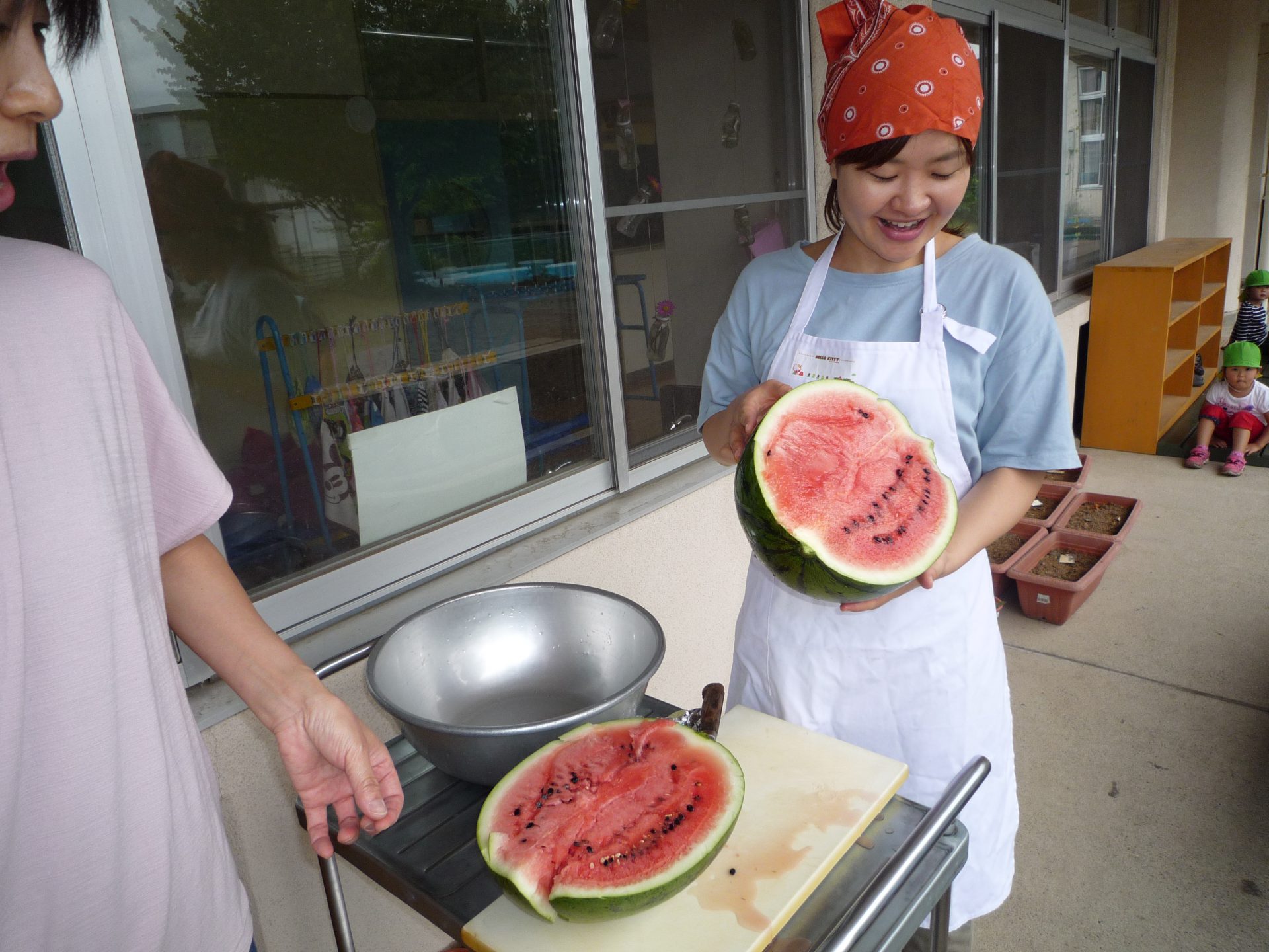 汗をかいた後の水分補給に5才児が畑で育てたすいかをわけてもらいました。