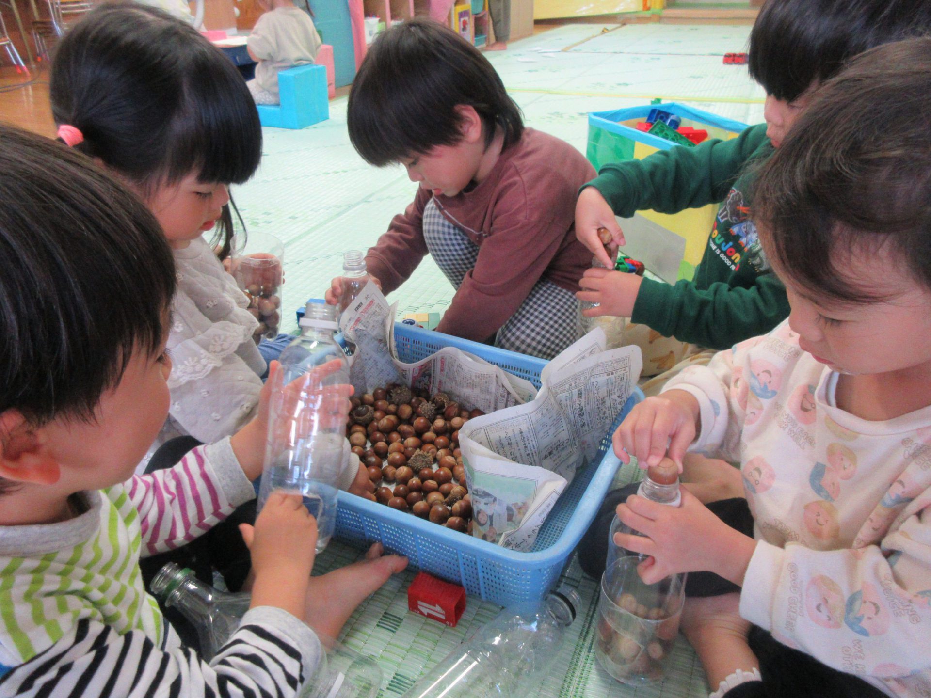 ・自由に遊べるようにどんぐりを置いたところ、ままごとやペットボトルに入れて遊んでいました。どんぐりを容器に入れて、お店屋さんになるなど、友達との遊びが広がっていきました。