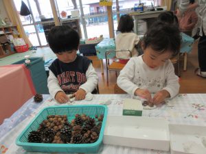 紙粘土を平べったく伸ばして、どんぐりや松ぼっくりをのせて遊んでいます。