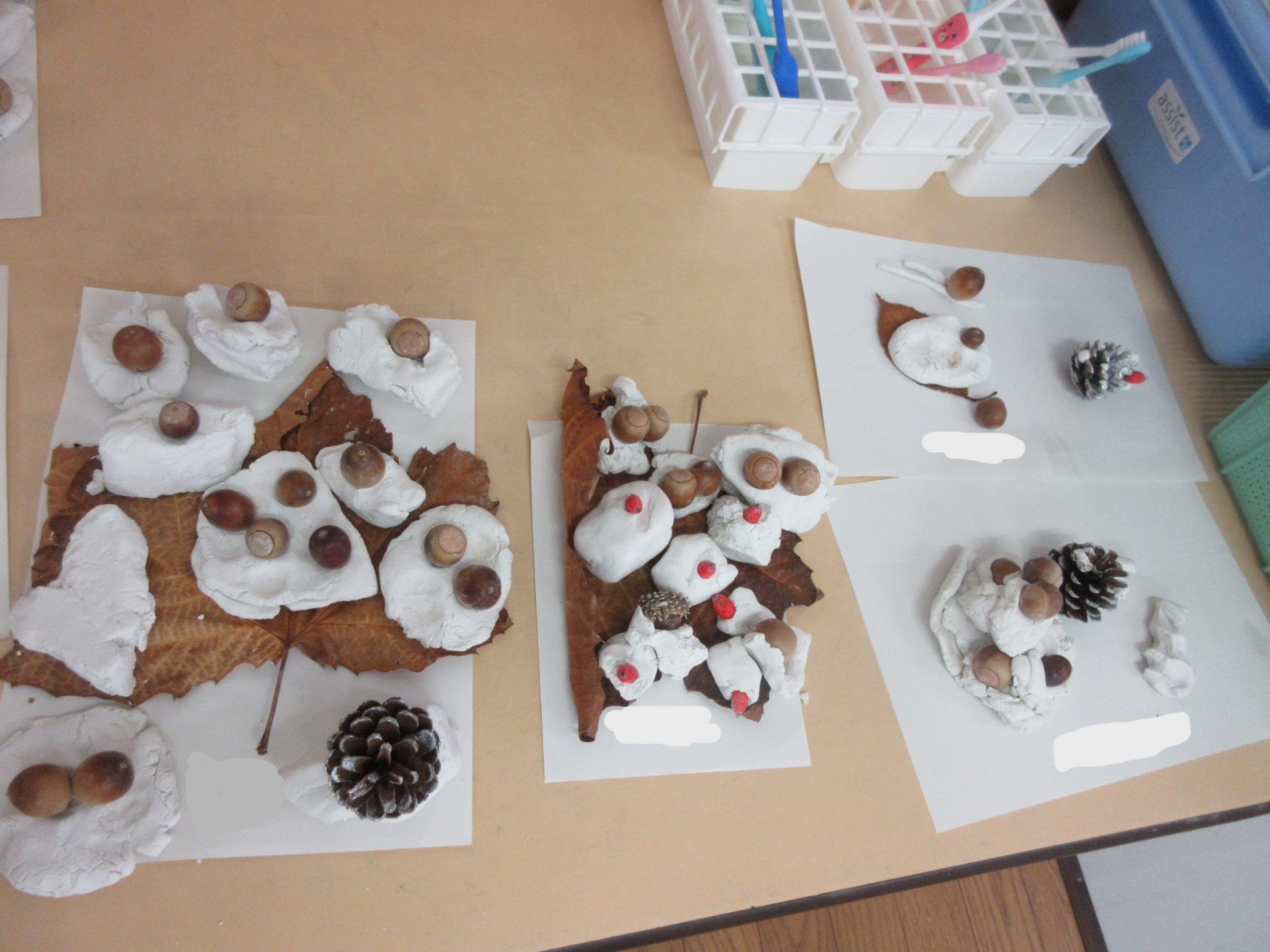 ・子ども達が考えて遊びを広げてほしいと思い、粘土やクレヨン、スタンプ台などを用意しました。その遊びの中で、どんぐりを使って自由に作り上げることができ、作った作品を保護者にも見てもらえるように室内に展示しました。