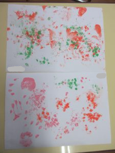 スタンプ台で落ち葉に色を付けて、「それ~!」と紙に押しつけてみると、