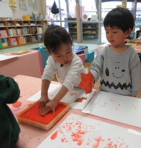 ・落ち葉を使った遊びでは、落ち葉をタイヤなどに見立てて絵を描いたり、スタンプ台に押しつけると葉っぱの模様や大きさ、色の違いに気づいて、「今度はこの葉っぱにする!」と選んで遊んでいました。