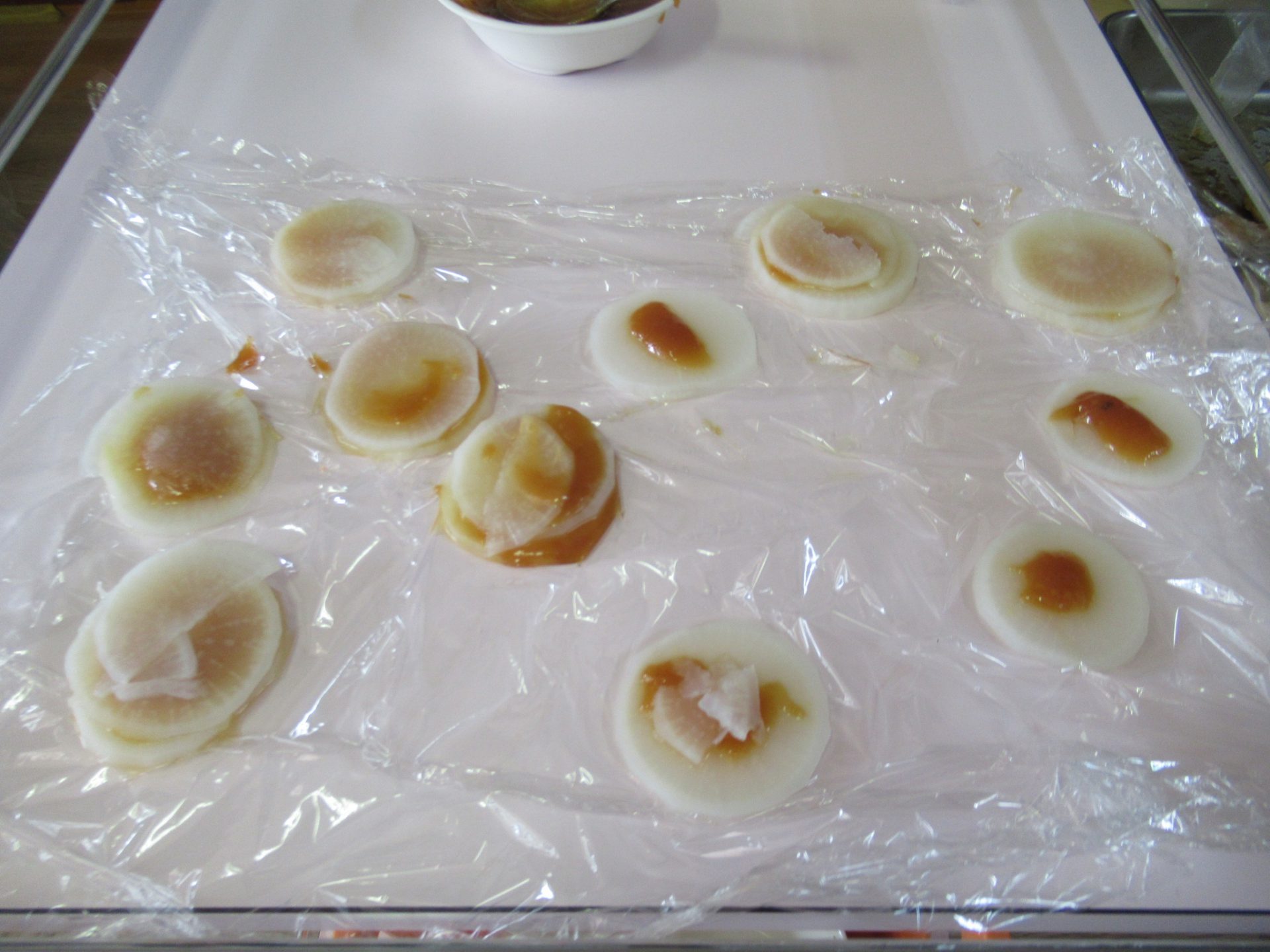 給食の先生にお願いして大根せんべいにしてもらいました。