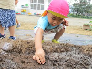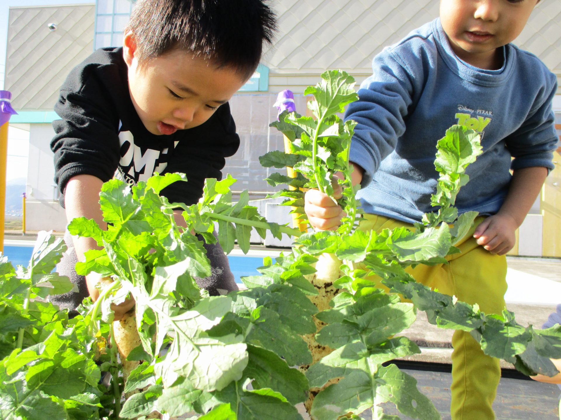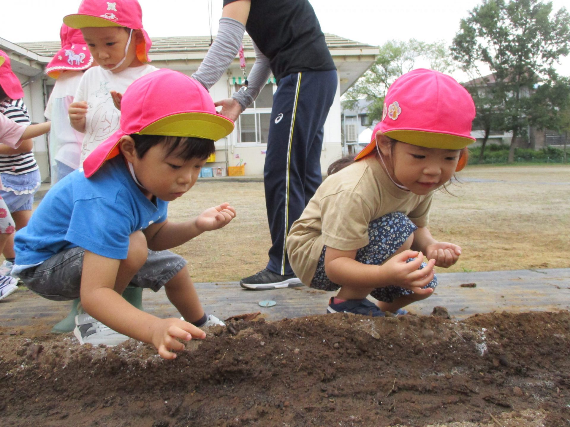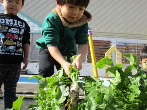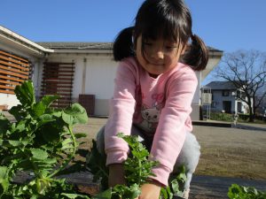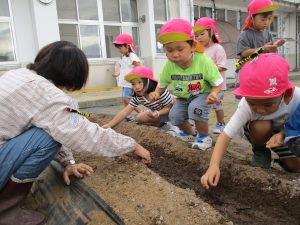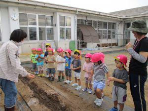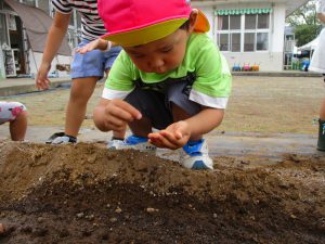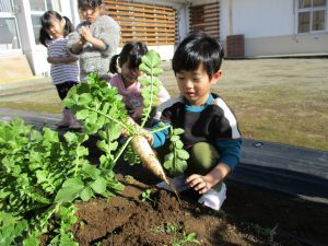 9月、クラスの子の祖母でもあり、地域の方でもあるおばあちゃんに、教えてもらいながら園庭の畑に大根の種植えをしました。