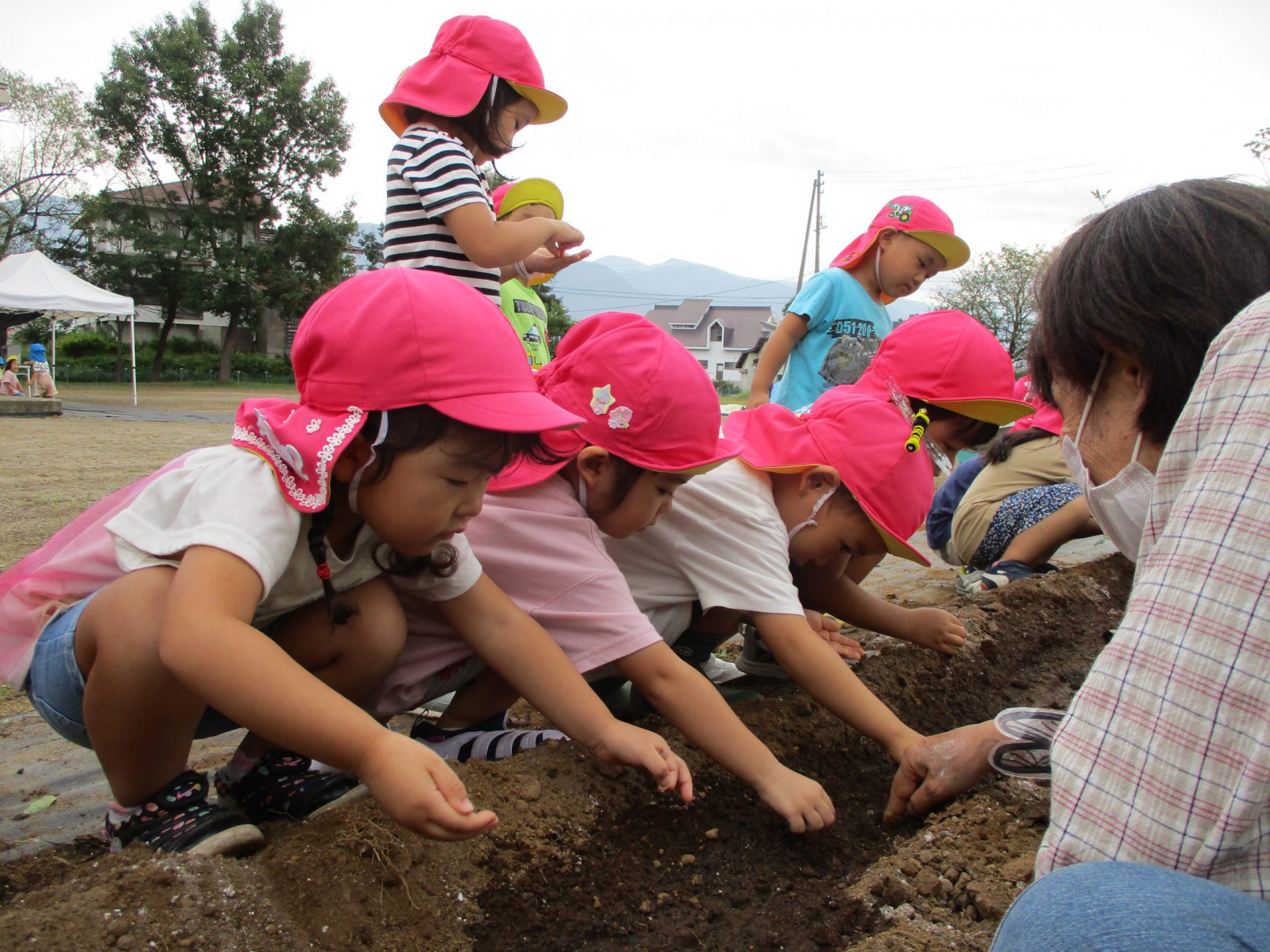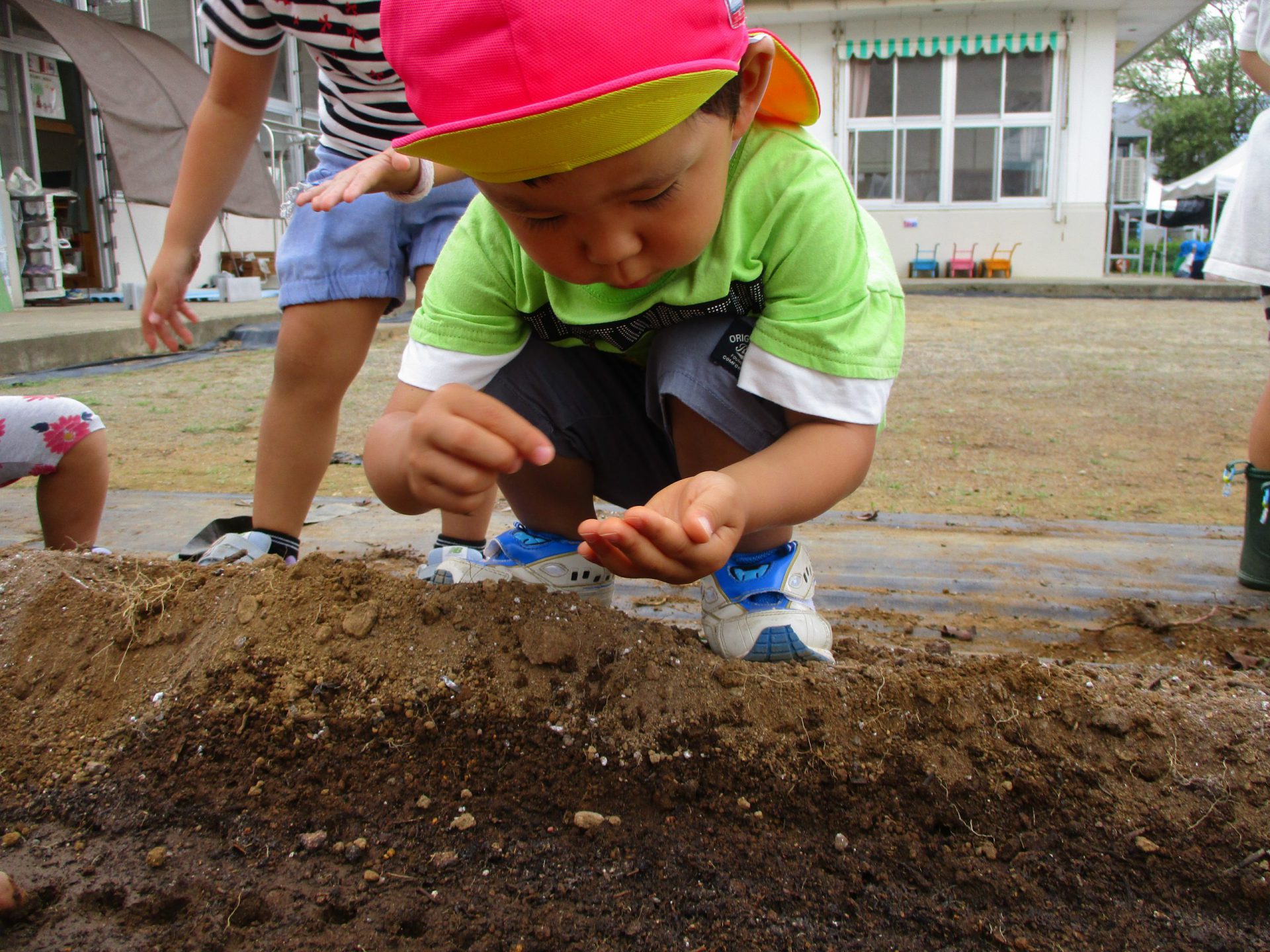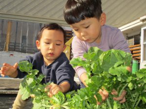 自分たちで種を土に植え、園庭に出る度に「おおきくなったかなあ?」と生長を楽しみにし、収穫も自分たちの手で行うことで、土に触れ、生長を目で見て、収穫を喜ぶ体験ができ、大切な自然体験ができました。後日、調理員の先生に調理していだだき、給食でおいしくいただきます。