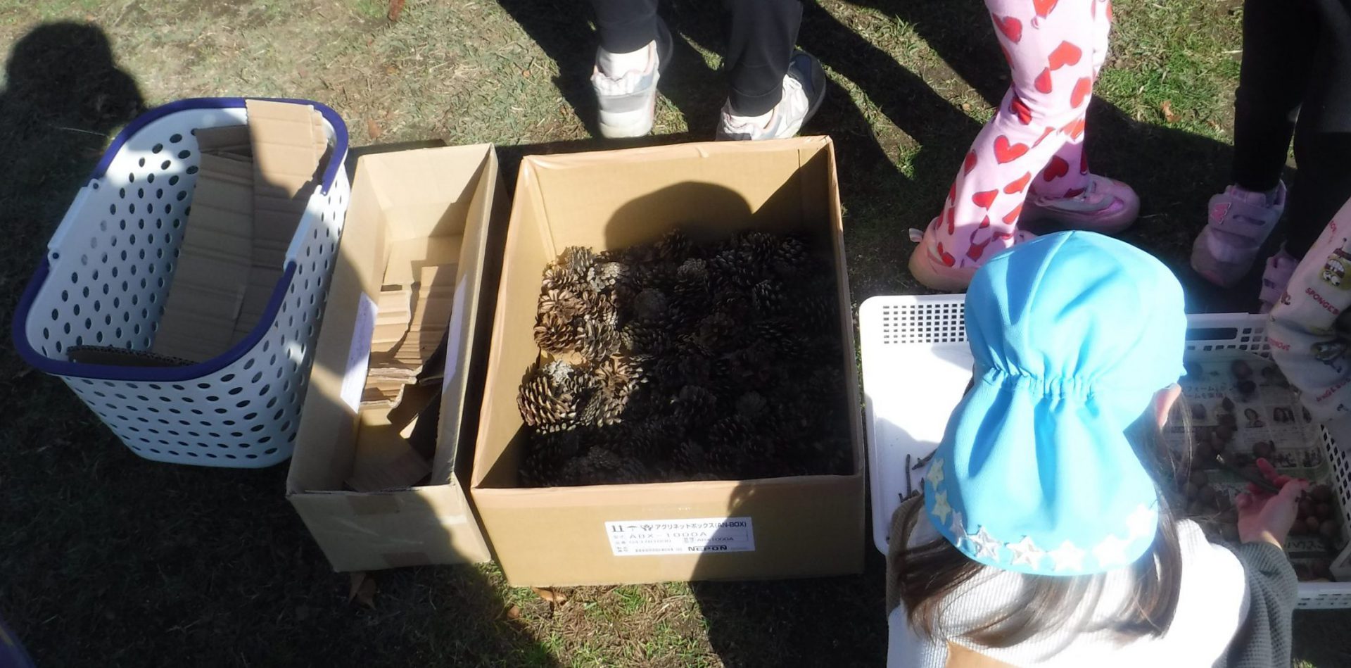 お散歩のたびにこつこつ集めていた松ぼっくり・どんぐり・木の枝などなど。