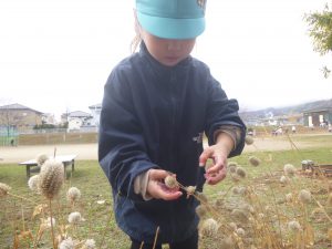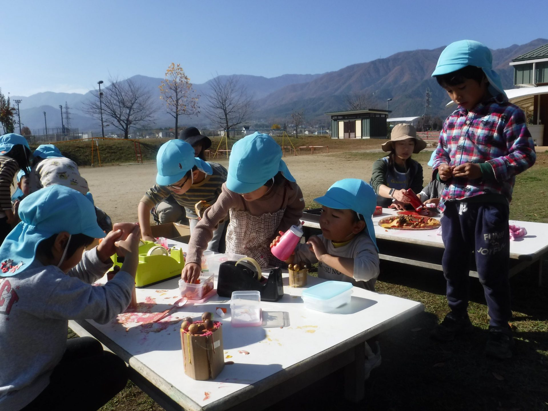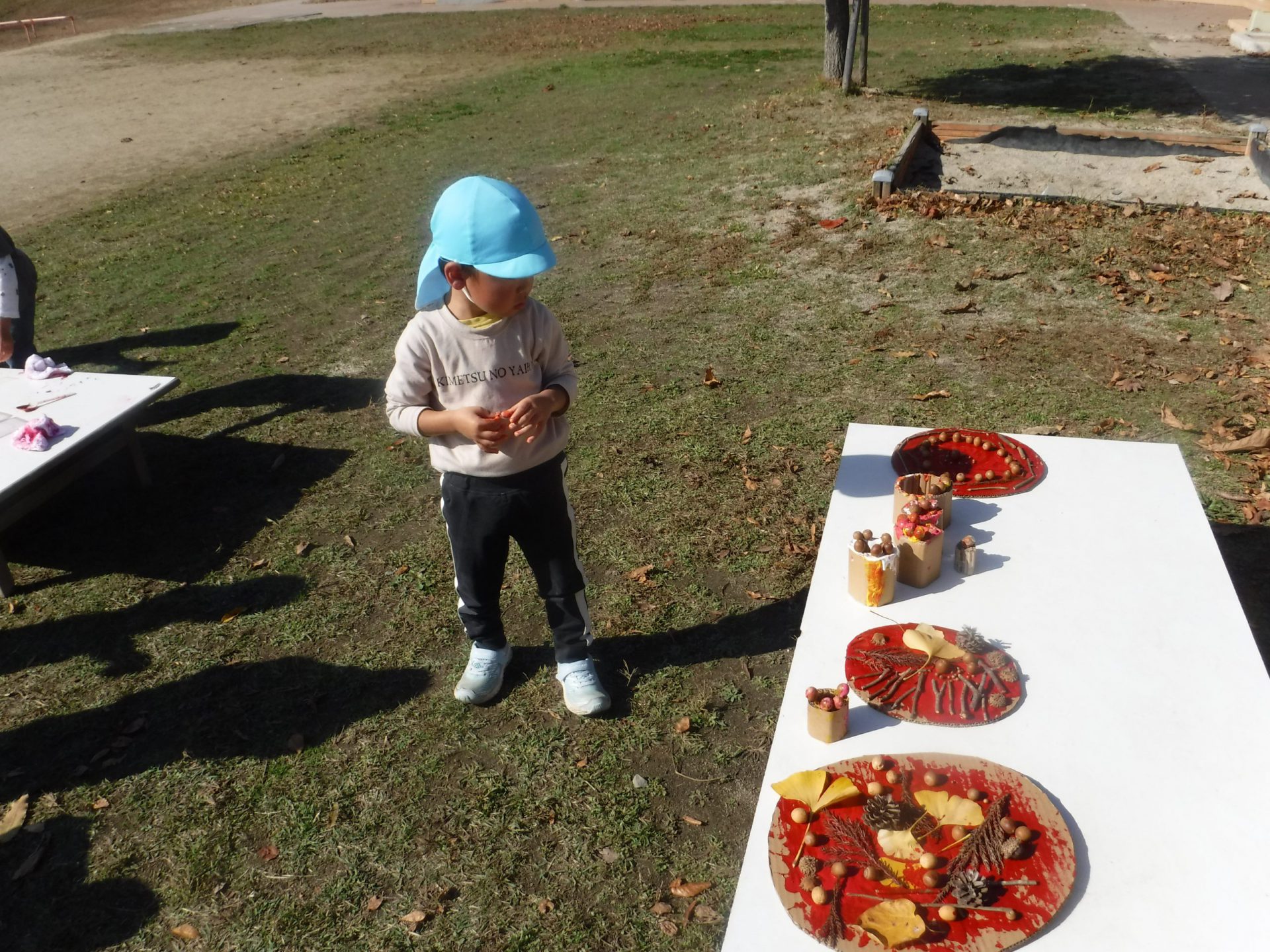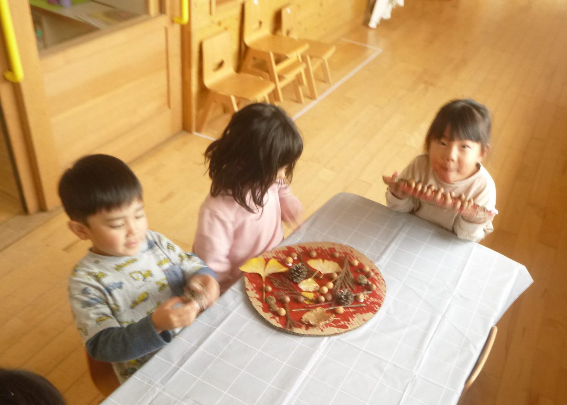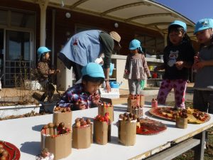 ・季節ならではの自然に触れ、その自然物を使ってさまざまな遊びにつながる・・・子どもの発想は素敵です。自分たちの思いが形になったときの喜びや達成感。それらが自信へと繋がりさらに友だちと協力して遊ぶ楽しさを知っていきます。これからも、できるだけ子どもの声を大切に拾い上げ、丁寧に見守って行きたいと思いました。