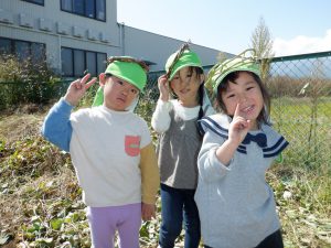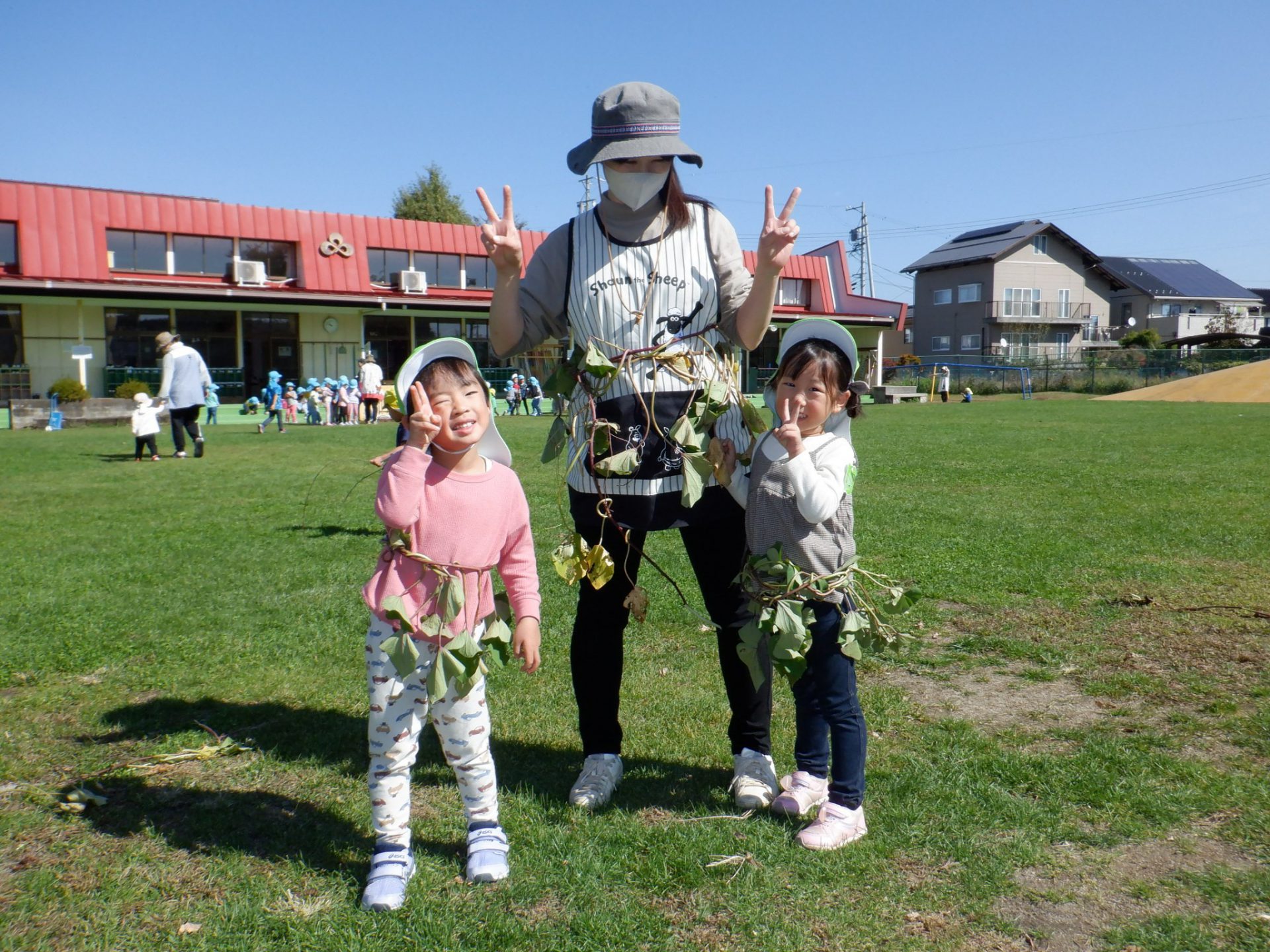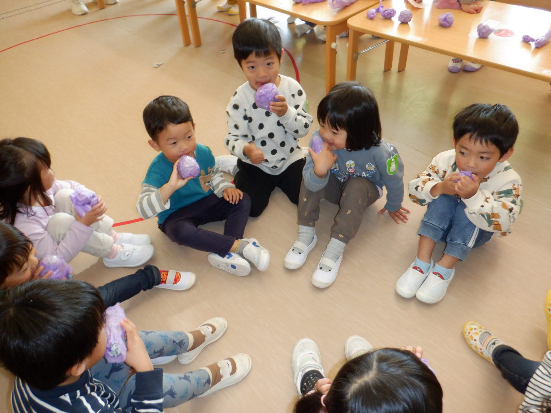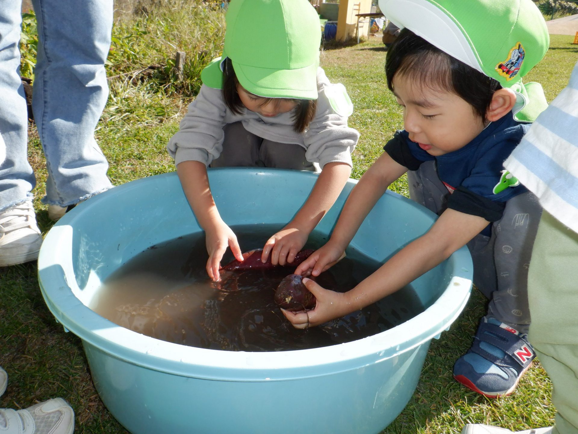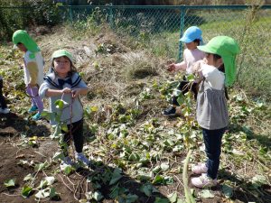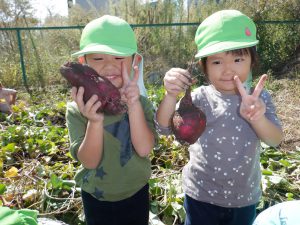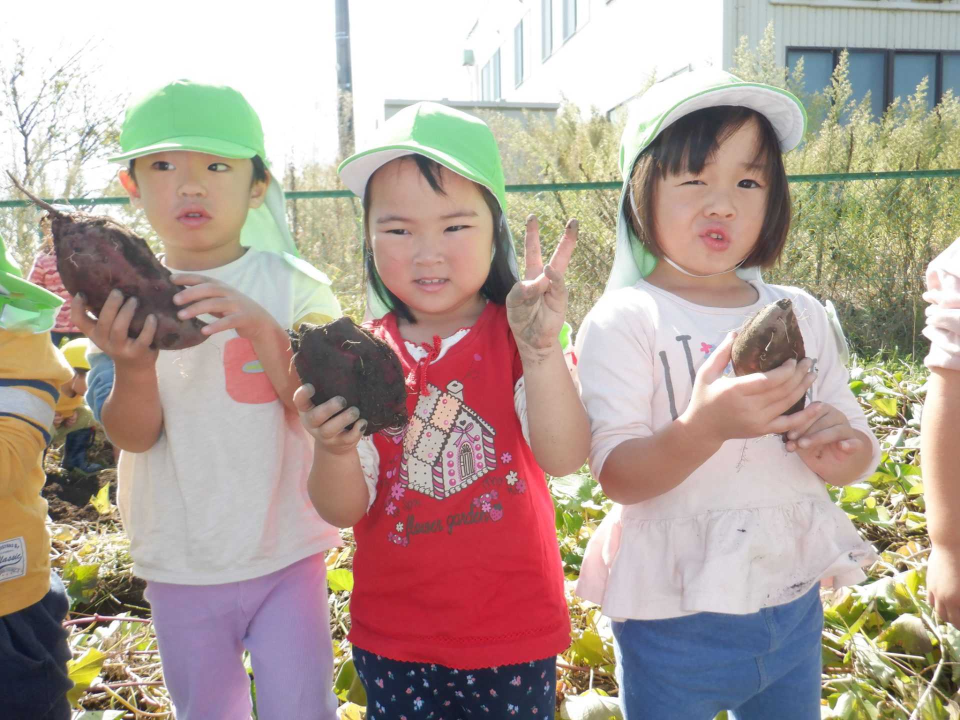 さつまいも掘りではお芋の形、重さを感じ「これ重たいね。」「大きい〜!」「ちっちゃいのもあったよ!」と興味深そうに友だちと話していました。
