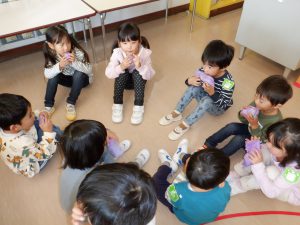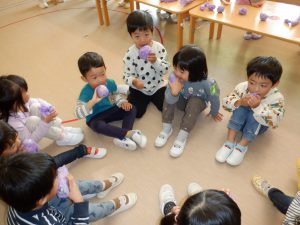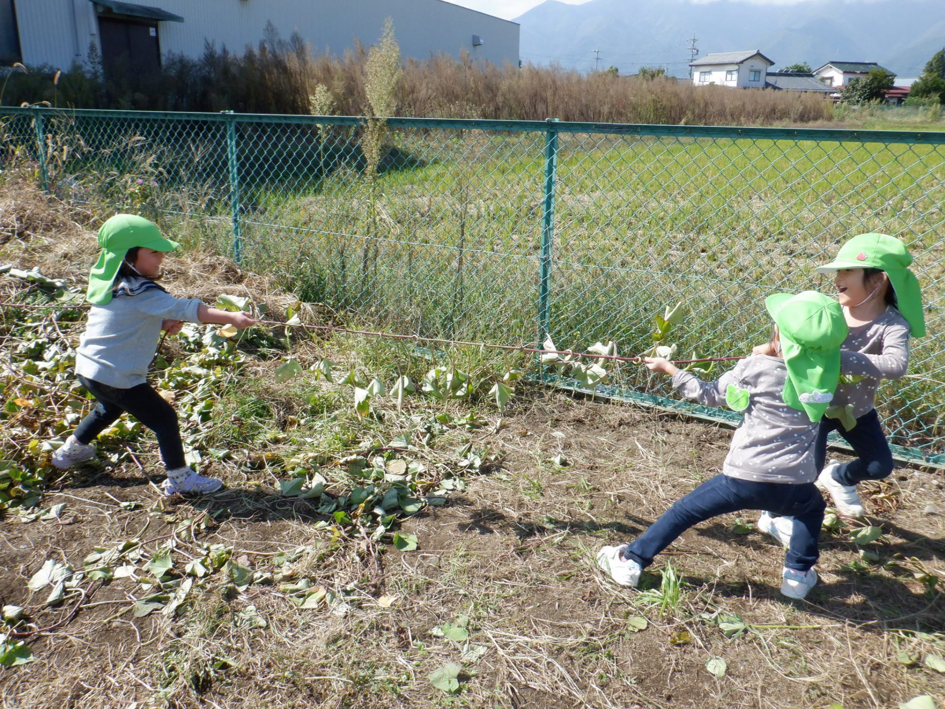 『おおきなかぶ』の絵本を思い出し、「うんとこしょ、どっこいしょ!」とひっぱりっこを楽しむ姿も・・・。