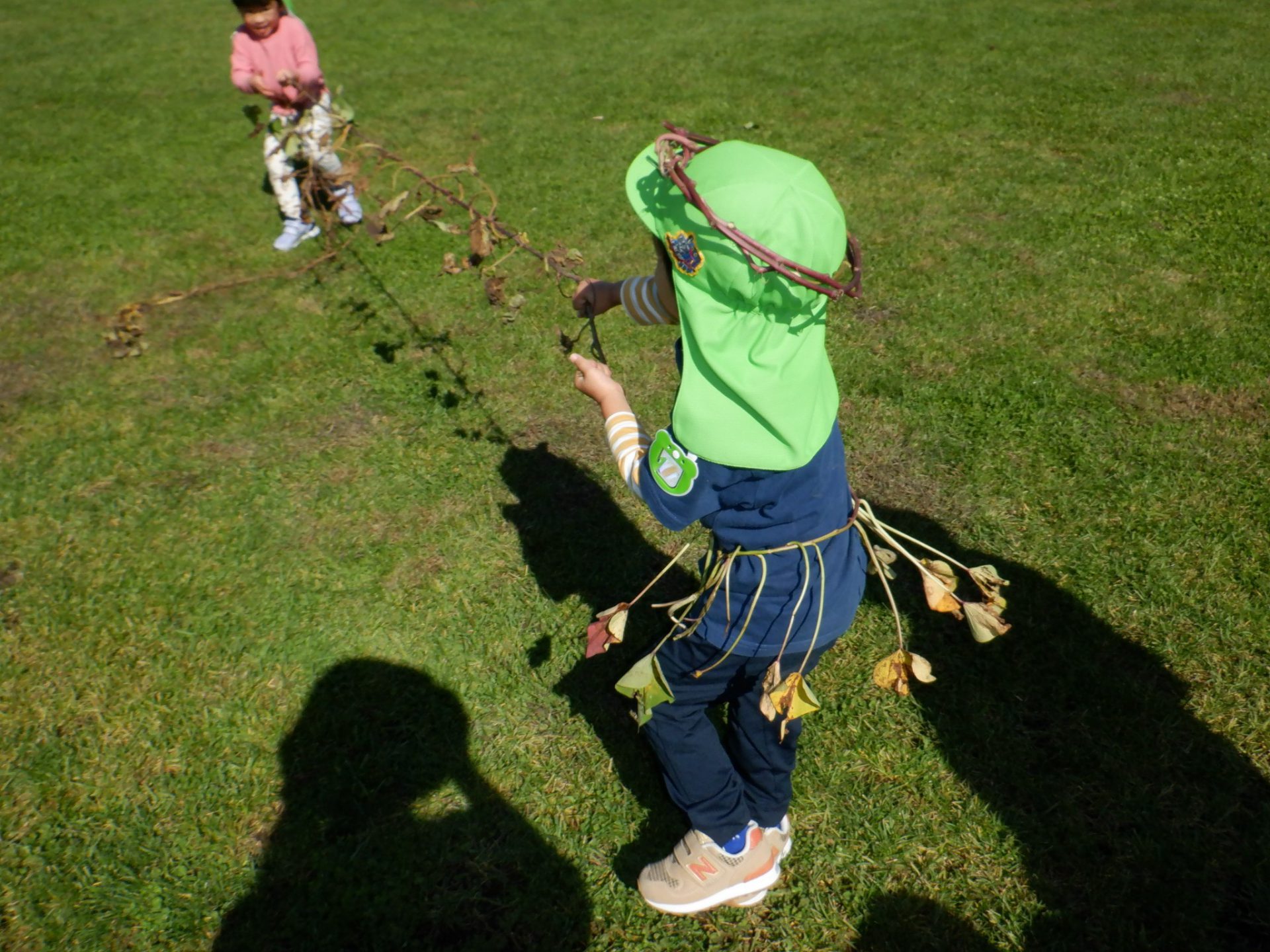 蔓を使って「ねぇ、かんむり作って。」と頭に乗せたり、腰に巻いたりして楽しむ子もいました。