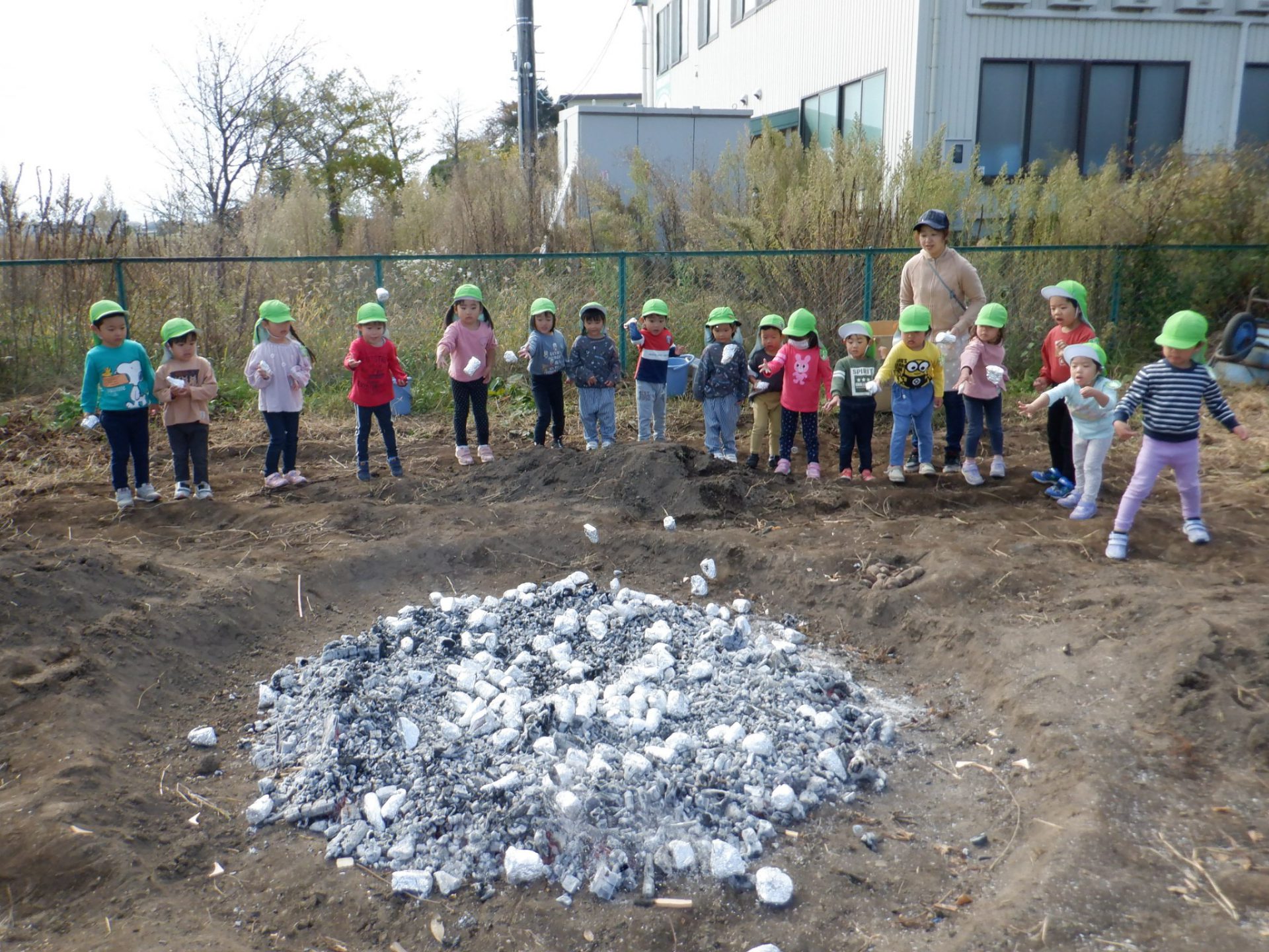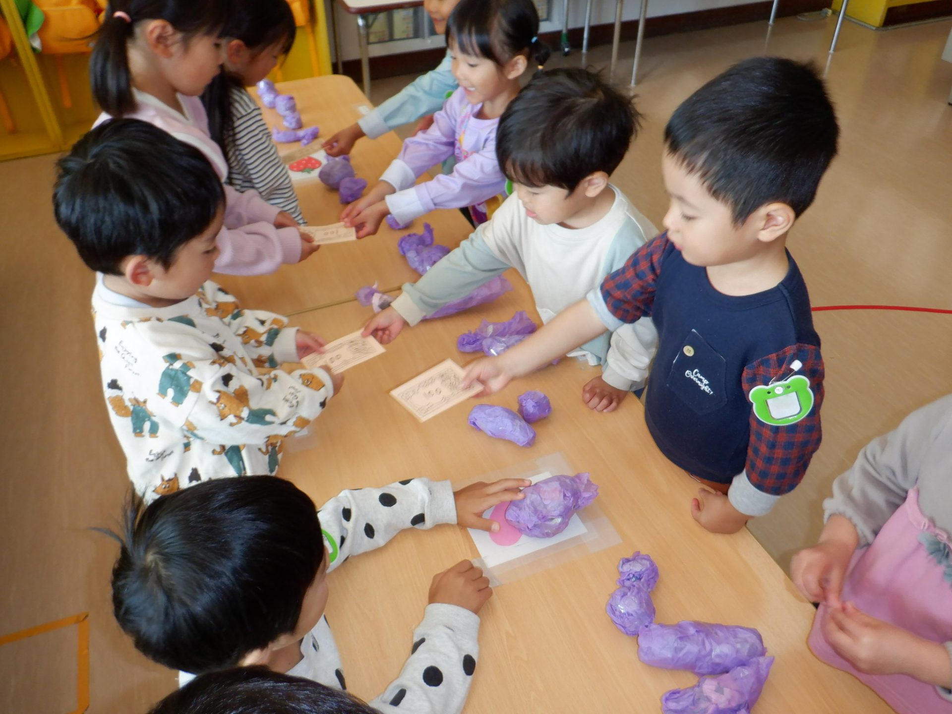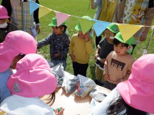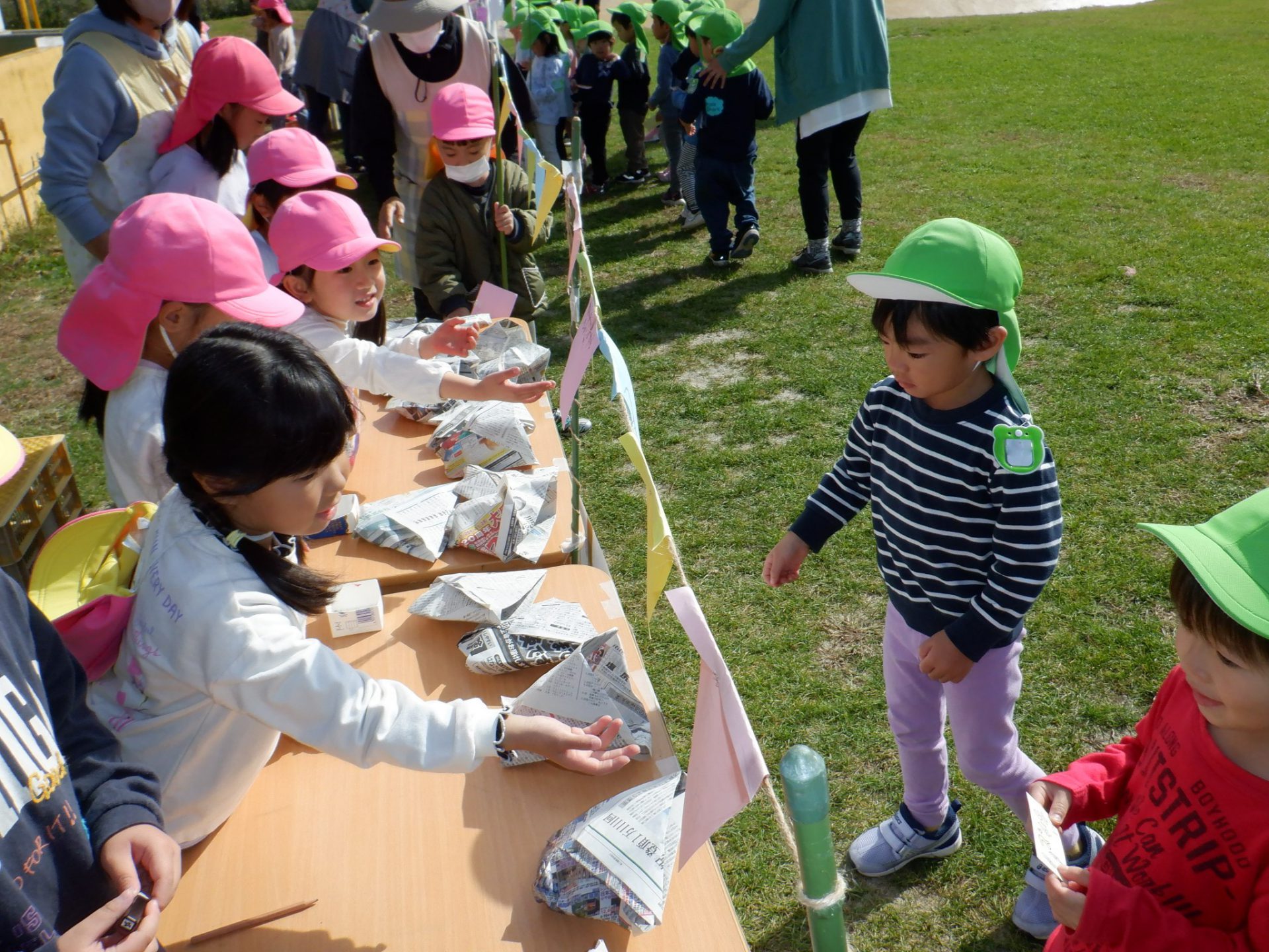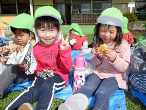 焼き上がると年長さんが焼きいも屋さんを開いてくれてチケットと引き換えにお芋をもらい、みんなで美味しくいただきました。