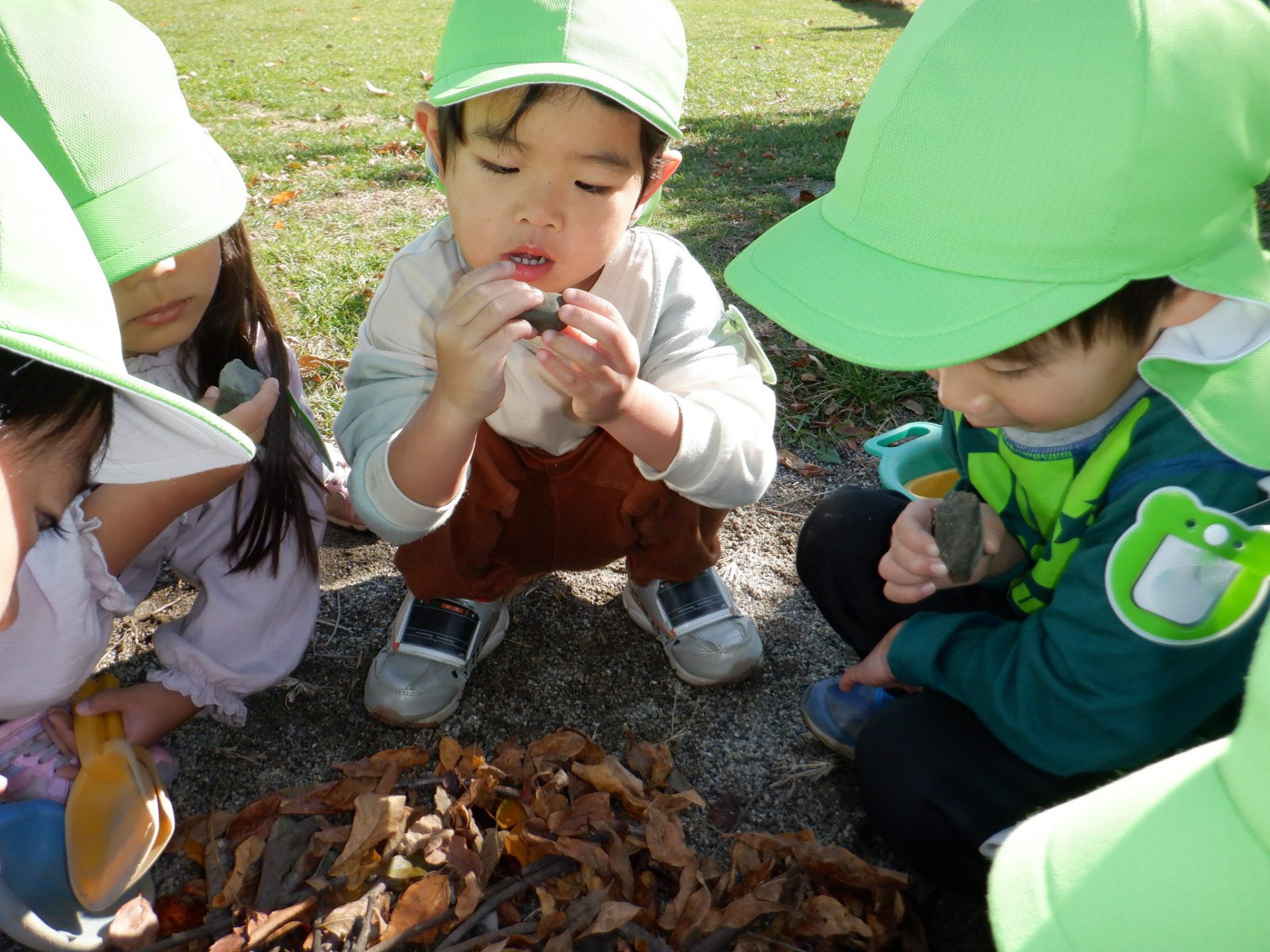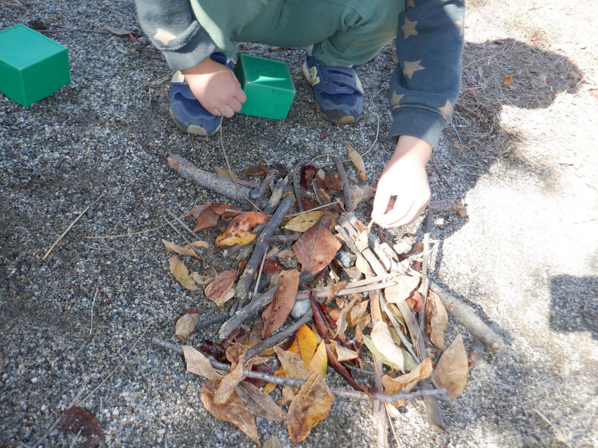 「外でも焼きいもごっこしよう!」と木の枝や落ち葉を集め、石を焼きいもに見立て、遊んでいました。