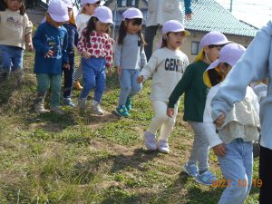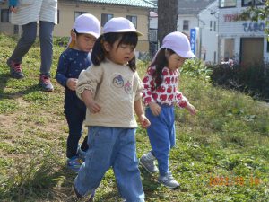 始めは保育士の後ろをゆっくり歩いて転ばないように慎重に歩く子ども達。