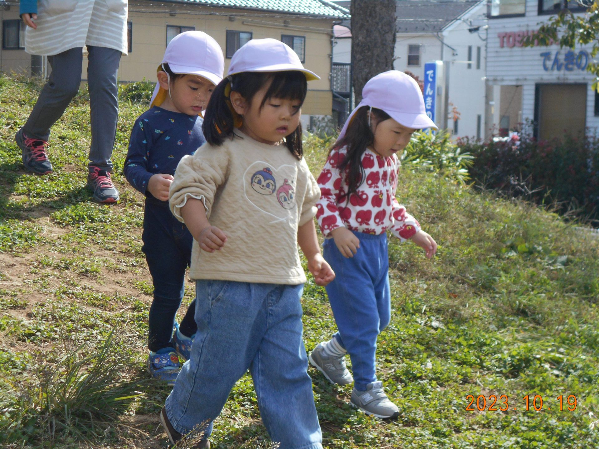 ・築山の周りを探索し葉っぱやどんぐりを見つけ保育士に「これなに?」と植物に興味を持っています。