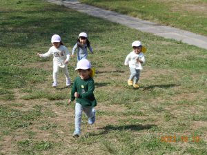 次は子ども達だけで築山を降りてみました。ドキドキしながら降りていく姿がありましたが慣れてくると「わぁー!!!」と全力で走り降りれるように!!