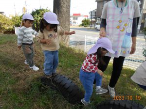 次はタイヤ歩き。保育士の手を取ってグラグラしながらも最後まで歩ききることができました◎