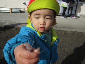 信濃町にもいよいよ冬が訪れ、日中太陽が出ていても肌寒く感じる日が続いていますが、そんな寒さにも負けず元気に戸外で遊ぶ子どもたち。「つめたいね」「しゃりしゃりしてるね」「かたいね」など保育士やお友達と感じたものを共有しながら冬ならではの自然物に日々触れ合っています。
