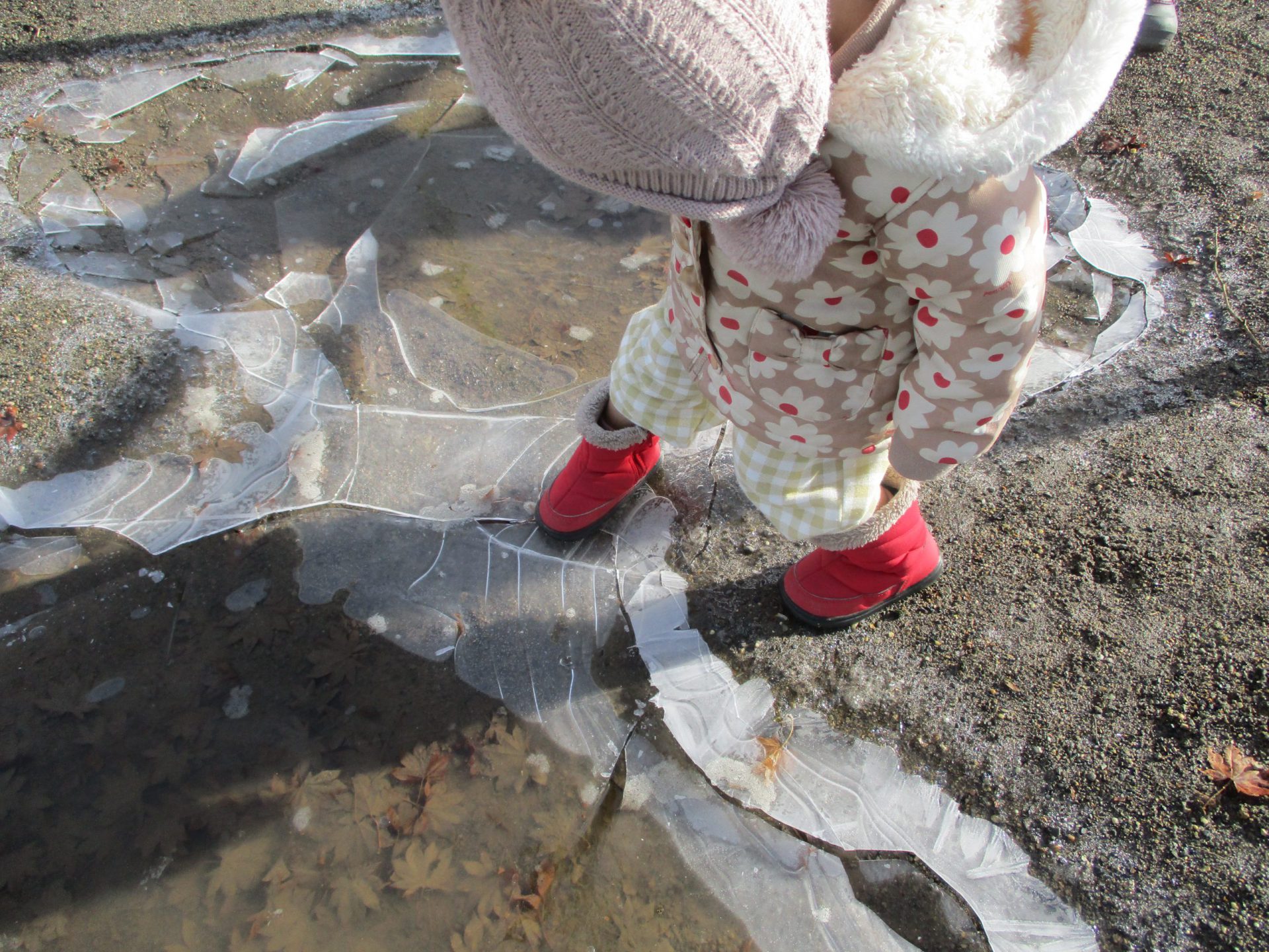 今度は水たまりに氷が張っているのを発見!足で踏んでパリパリっという音を楽しんだり…