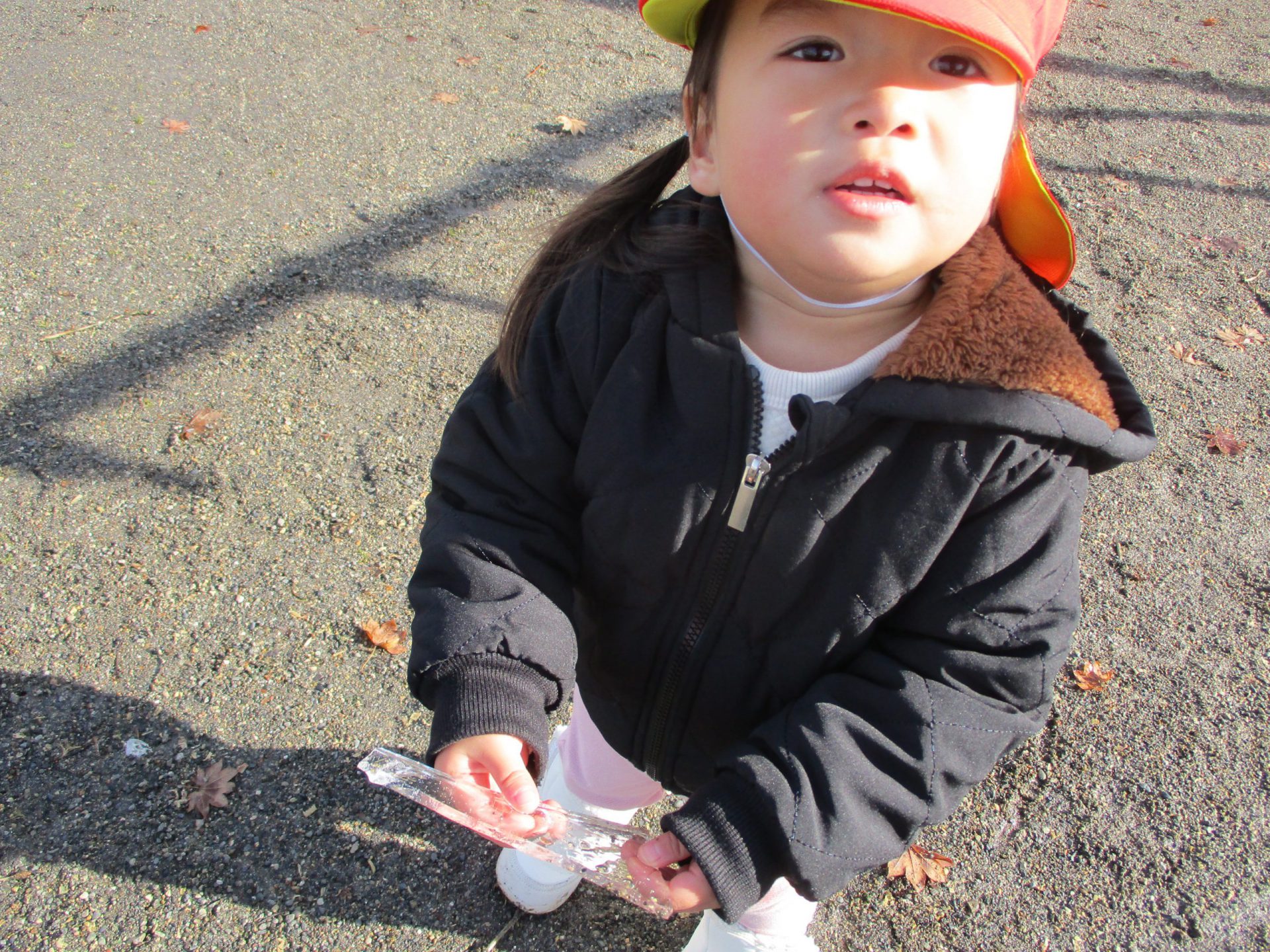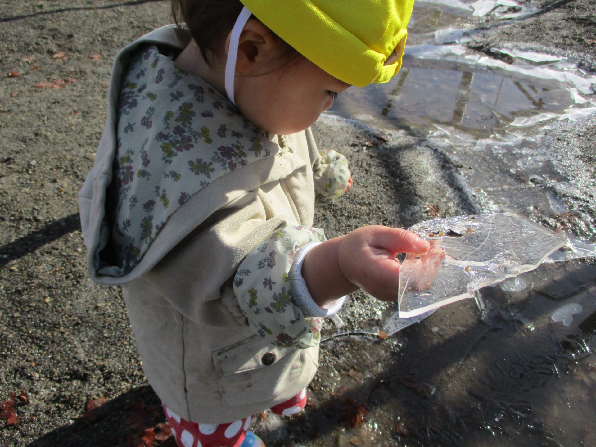 踏んで割れた氷を手で持って「みて!きれいだよ」と保育士に見せてくれたり、「つめたいっ!」と冷たさを味わったり…