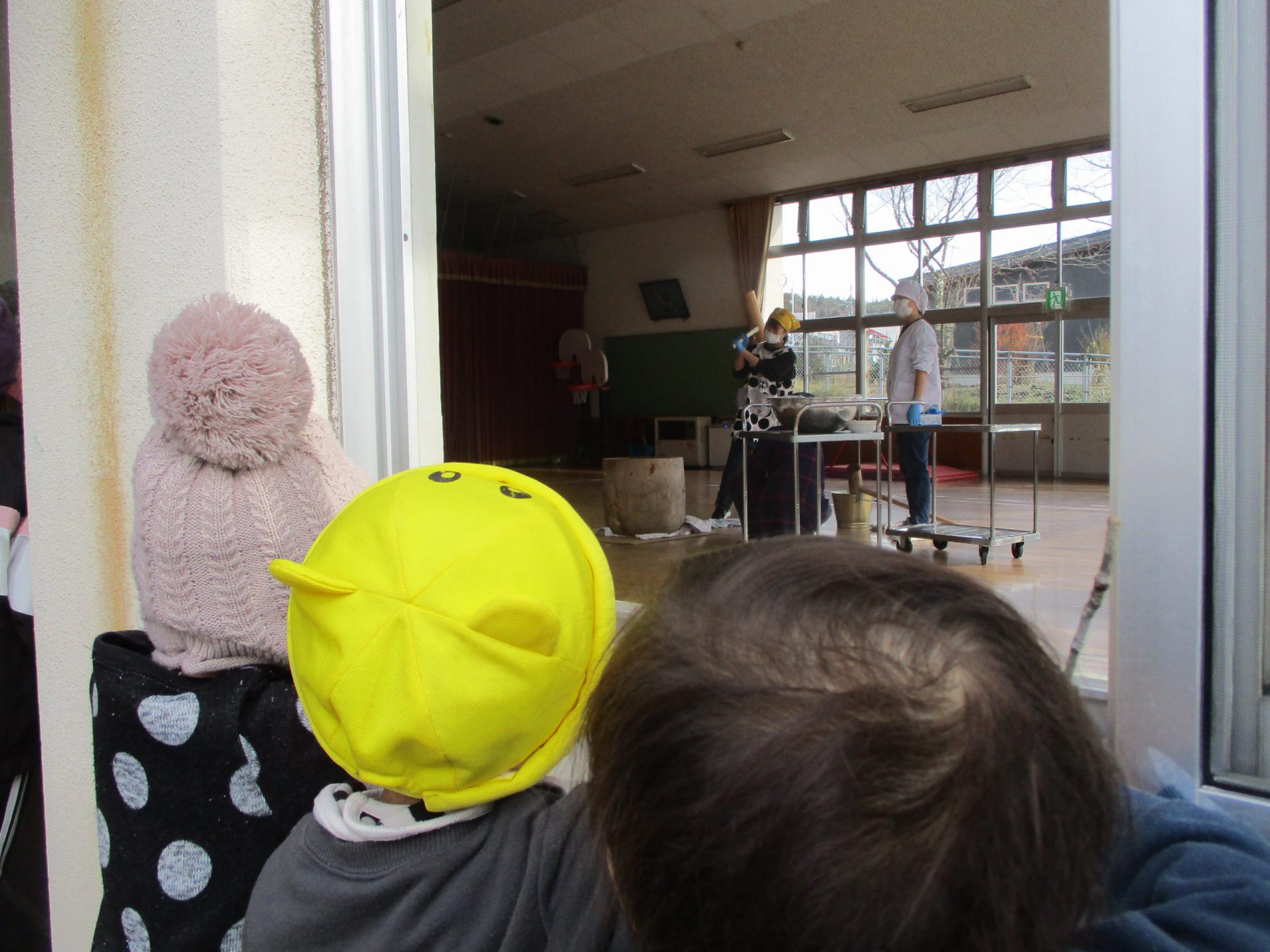 餅つき会では、戸外の窓からリズム室を覗いて、職員がおもちつきをしているところを見学👀「なにやってるのかな」と興味津々の子どもたち。
