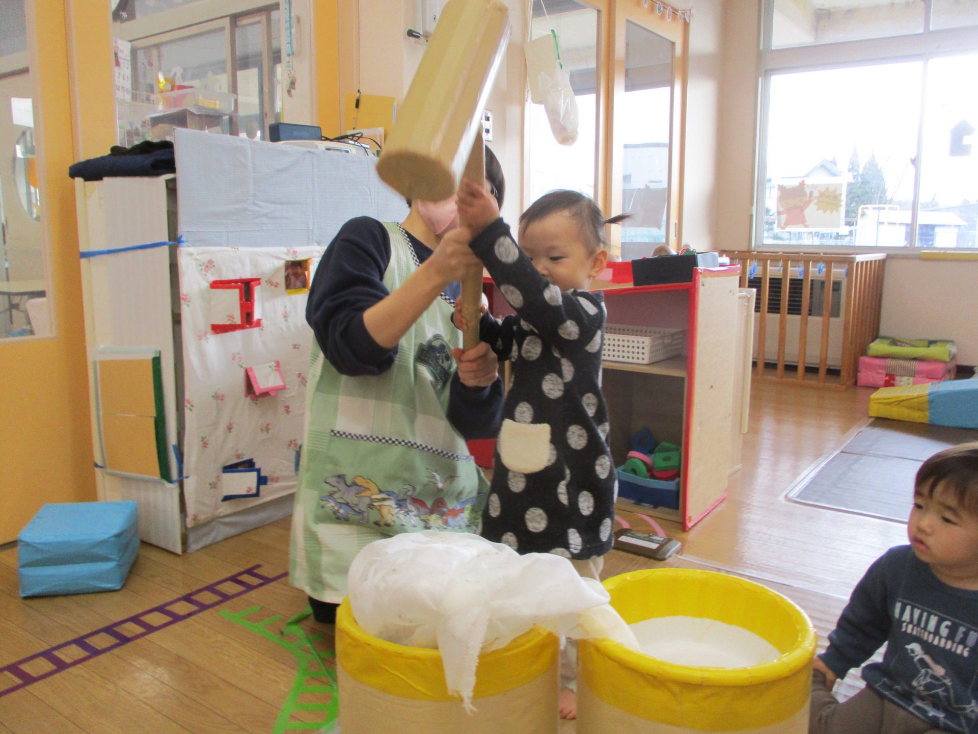 みんなで、もちつきの歌を歌いながら保育士と一緒に「ぺったんこ、それぺったんこ!」とおもちつき。見ているお友達は手を叩いて盛り上げてくれていました!
