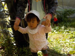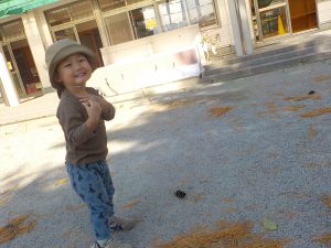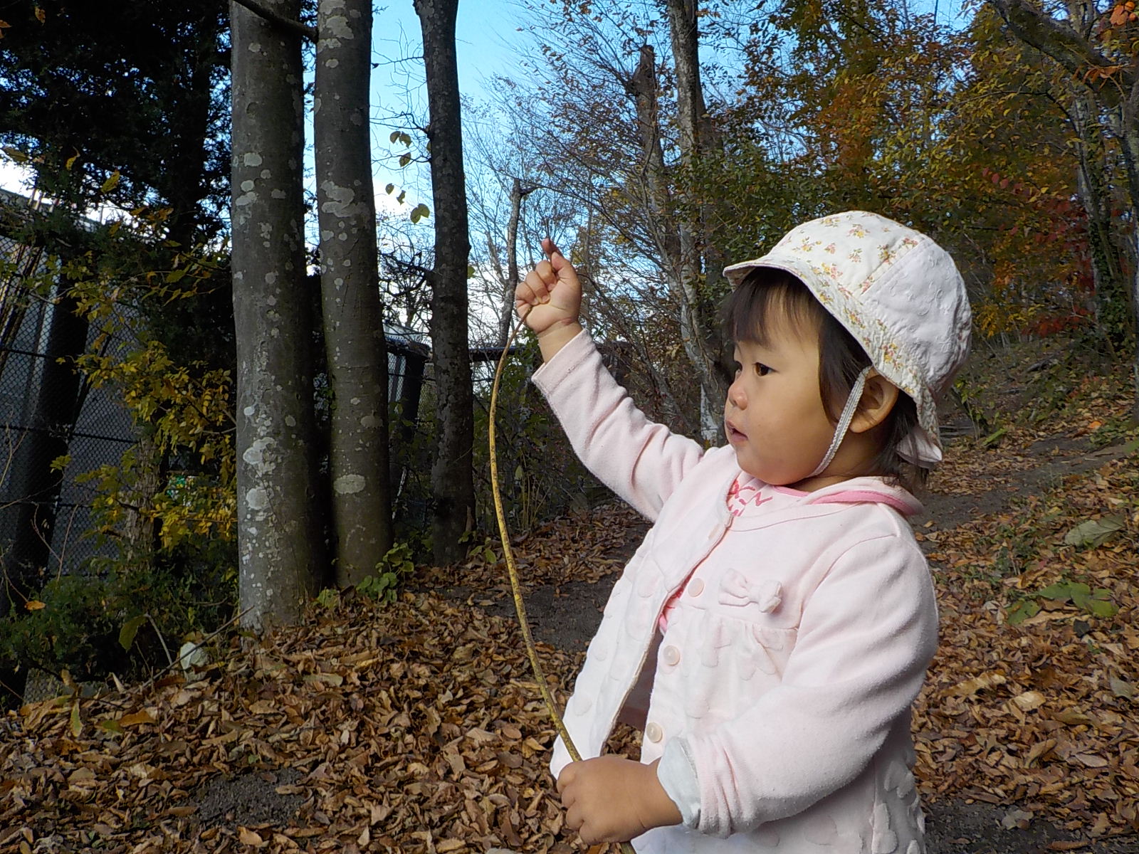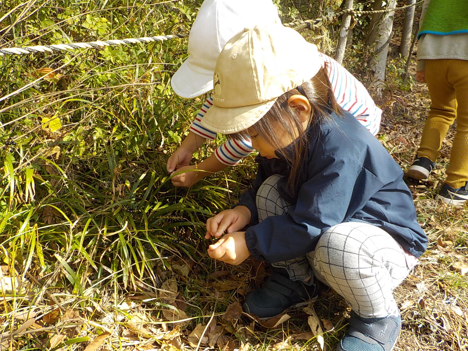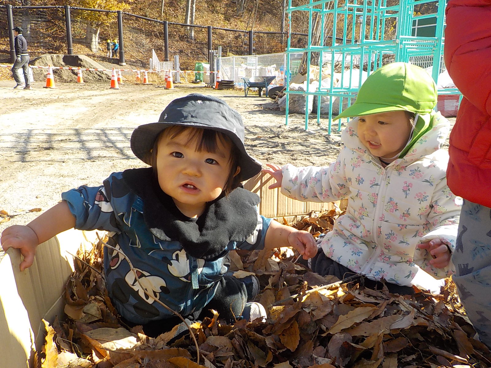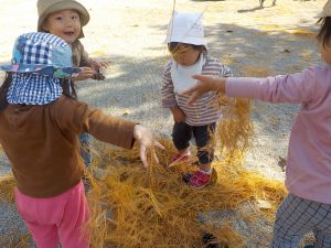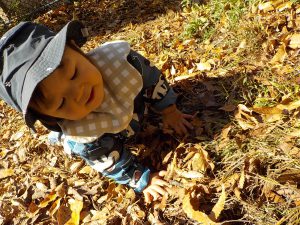 だんだんと秋が深まっていく時期、戸外遊びをする中で園庭を散策したり、山のふもとで山歩きをしたり、田んぼや畑の畦道などに散歩に出かけて、いろいろな場所で秋ならではの自然を感じてきた0.1歳の子どもたち。