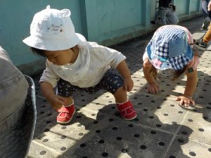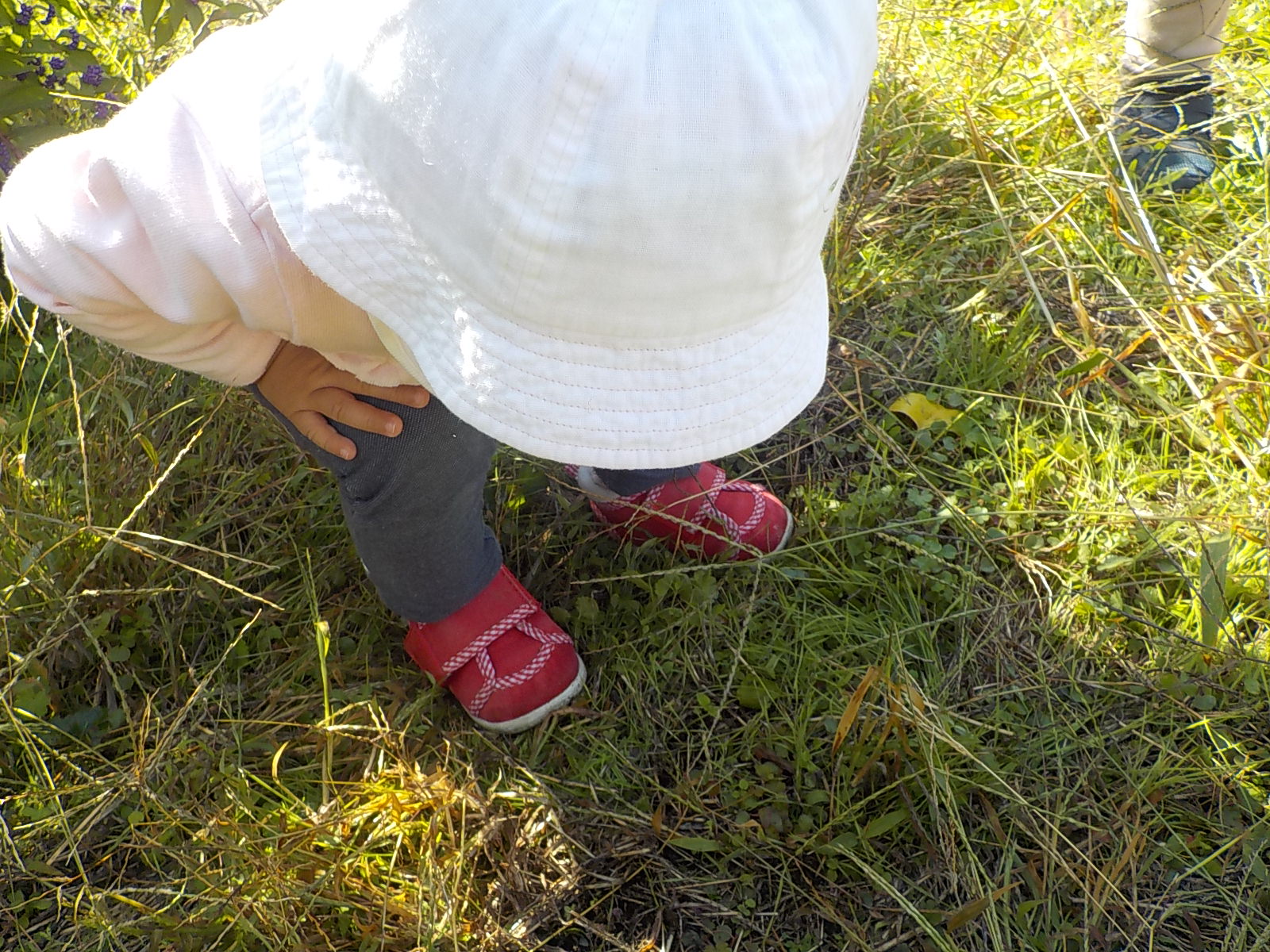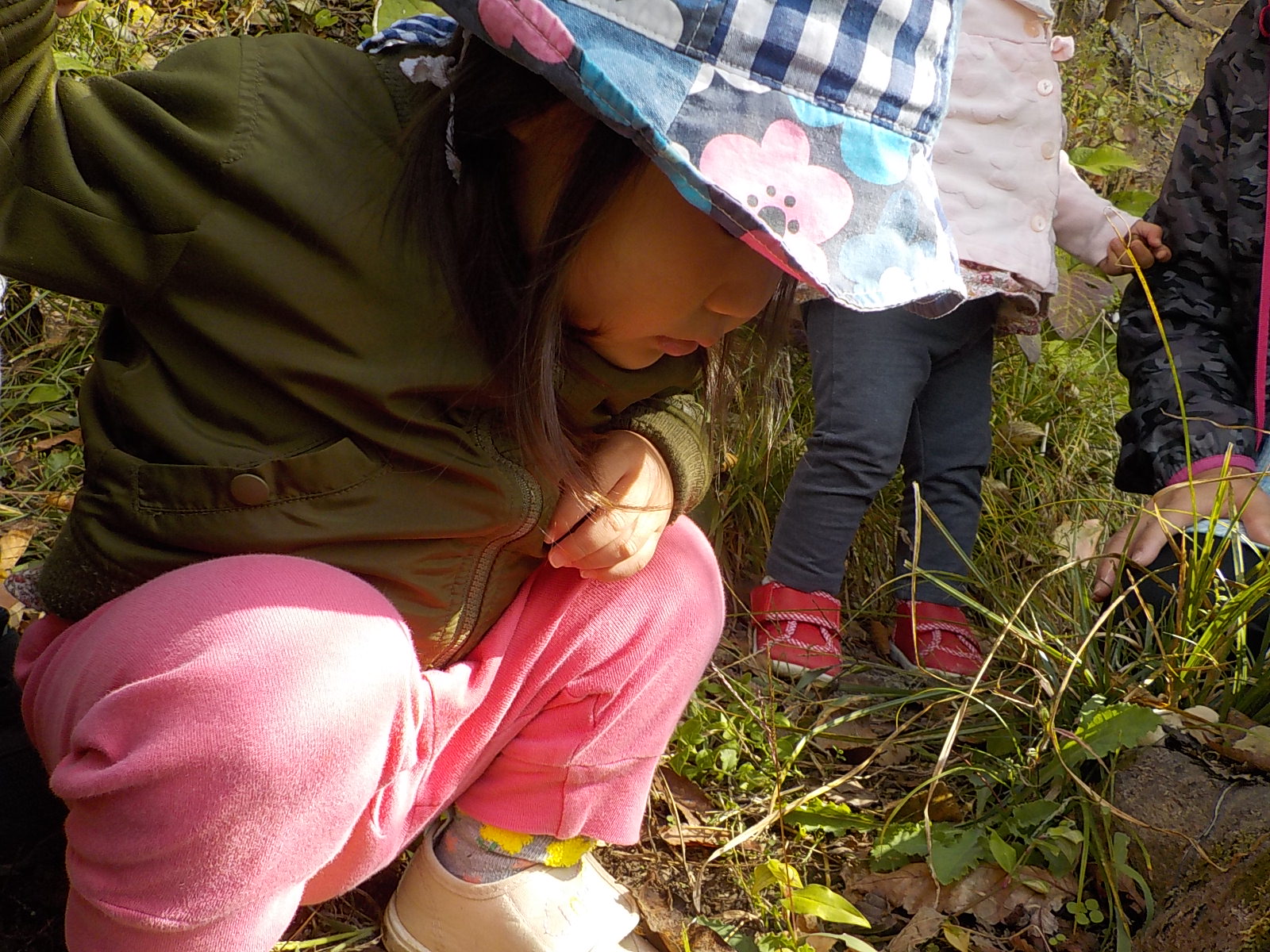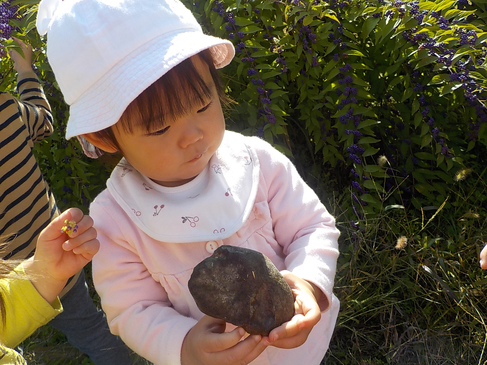 子どもたちは戸外で、すぐ近くに見える様々なものを発見し、手で触れたり足で踏んだりじ〜っと見つめたり・・・