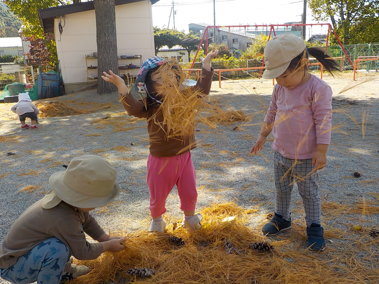 ある日、強い風がびゅうびゅう吹いて、園庭の大きな松の木から黄色くなった葉の先がたくさん落ちてきました。風がやんで、外に出てみると・・・