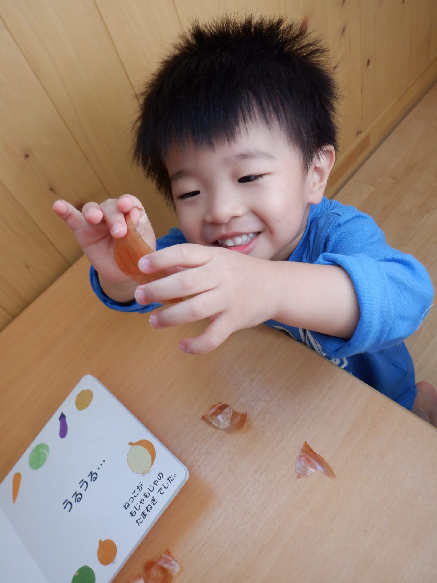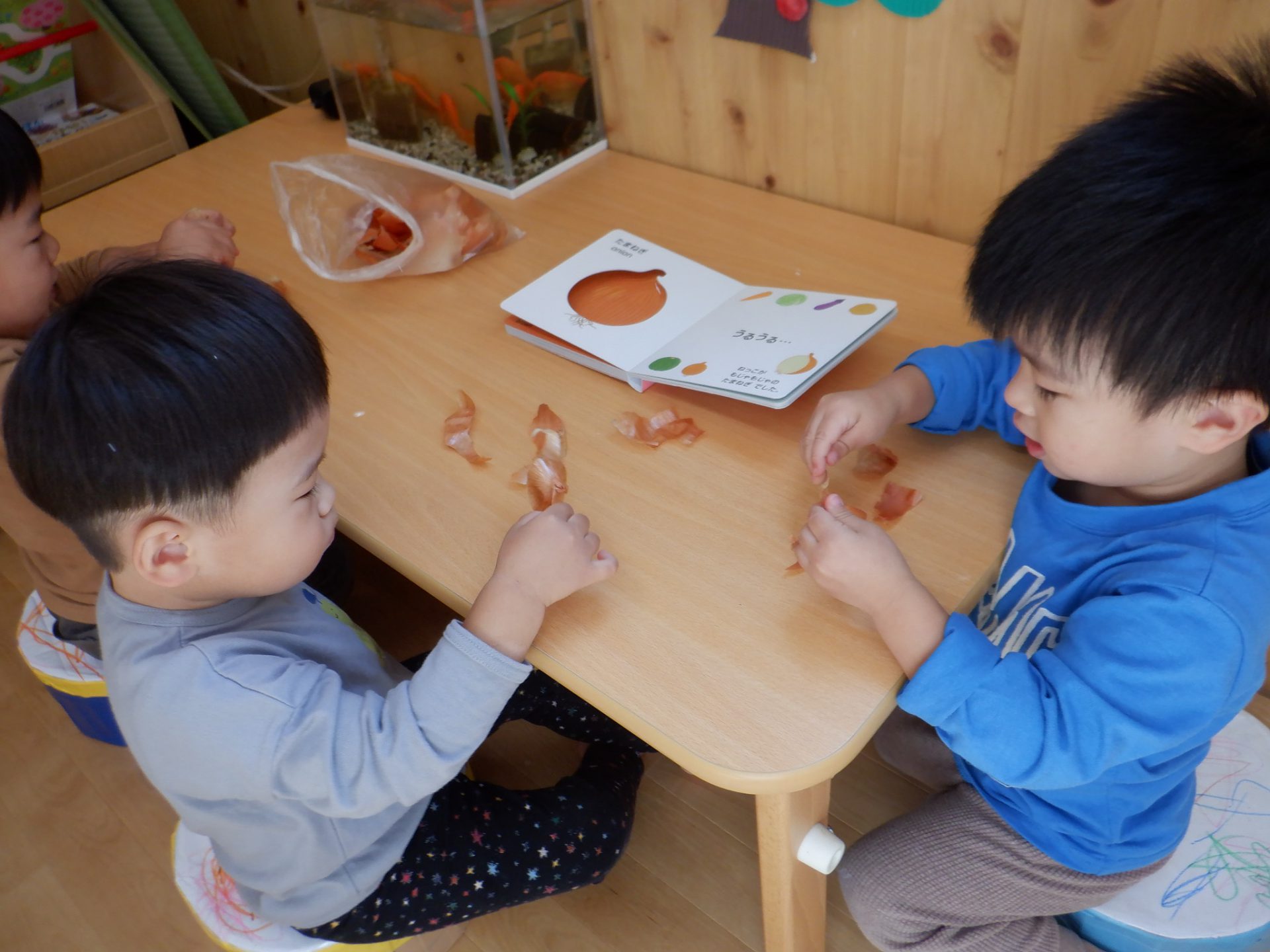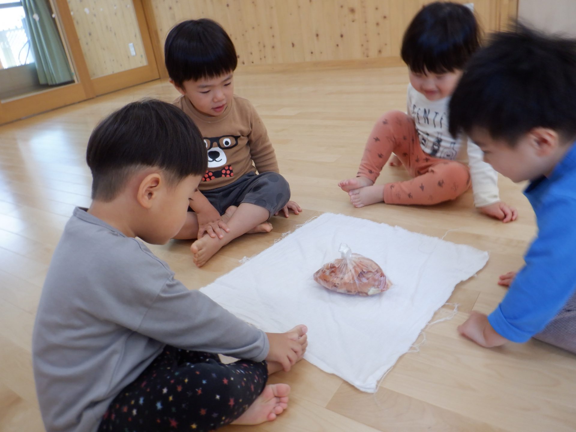 給食の先生からもらった玉ねぎの皮を触ったり、