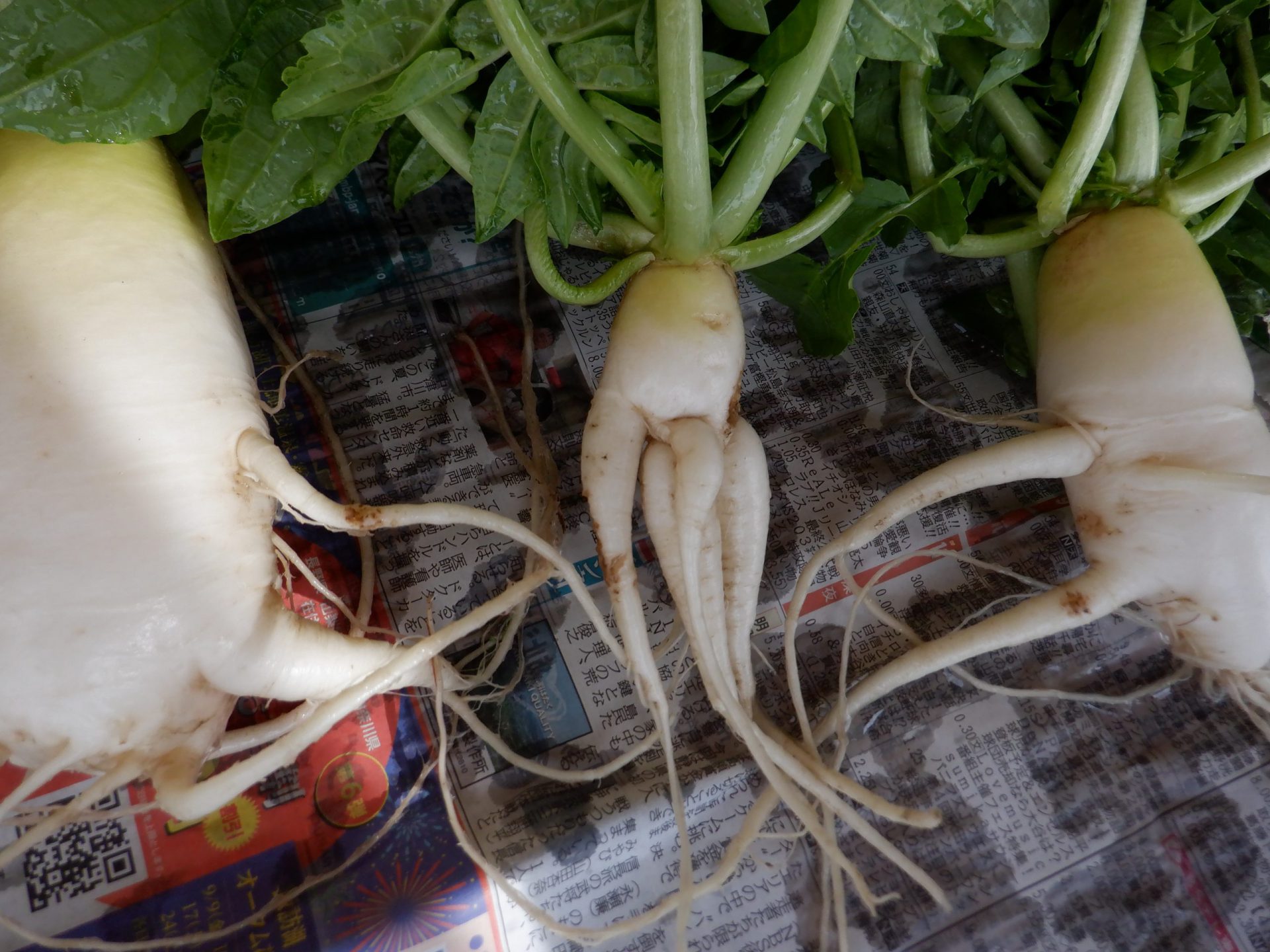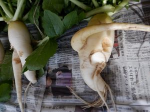 足が何本もあるような大根・・・いろいろな形の大根が収穫できました。