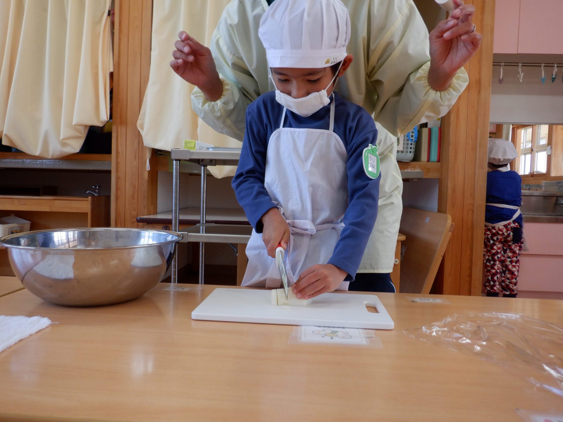 初めての包丁にドキドキしながらも、「こっちの手は猫の手だよ」と言って大根をおさえ、真剣に切りました。