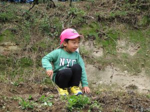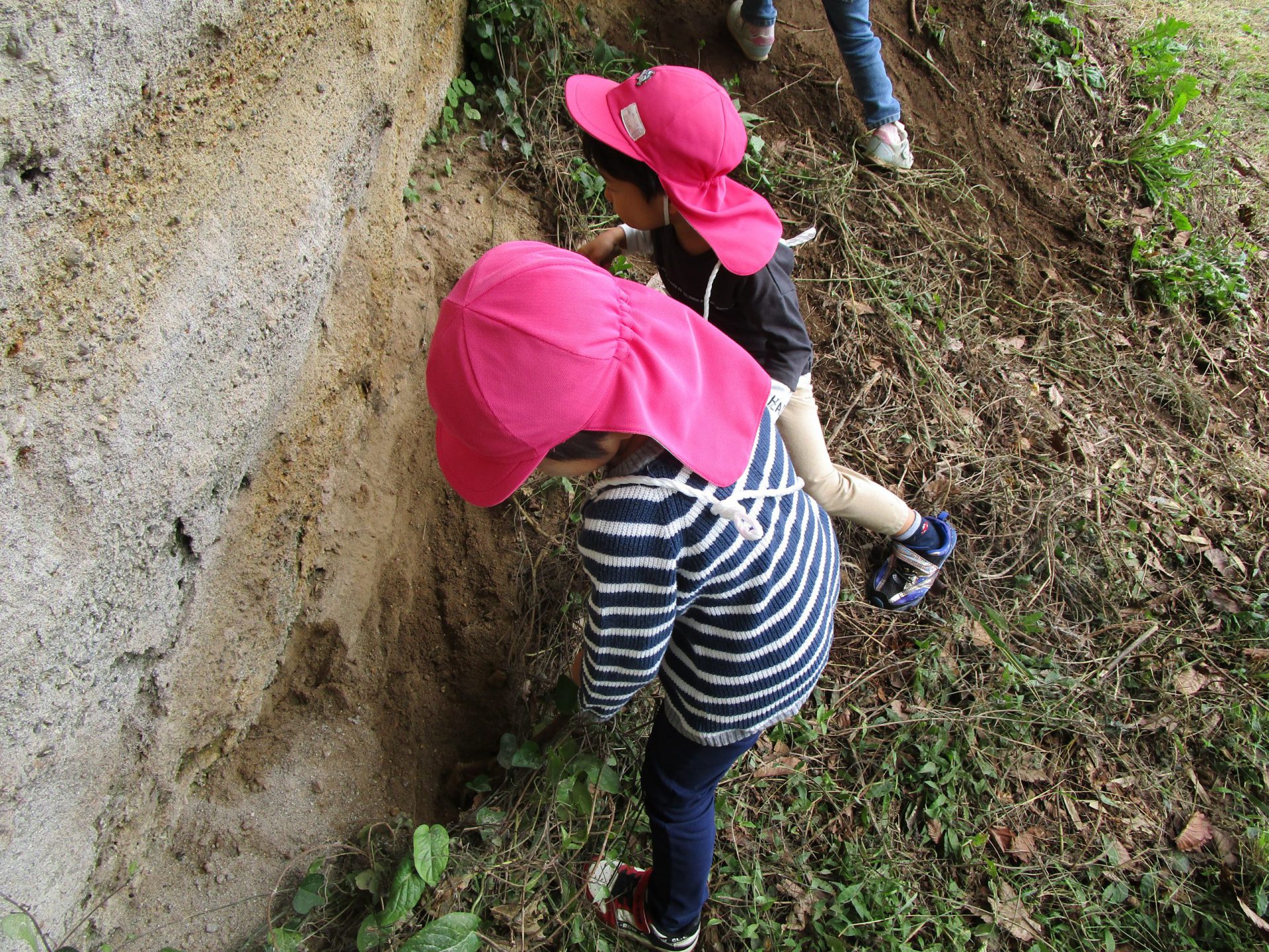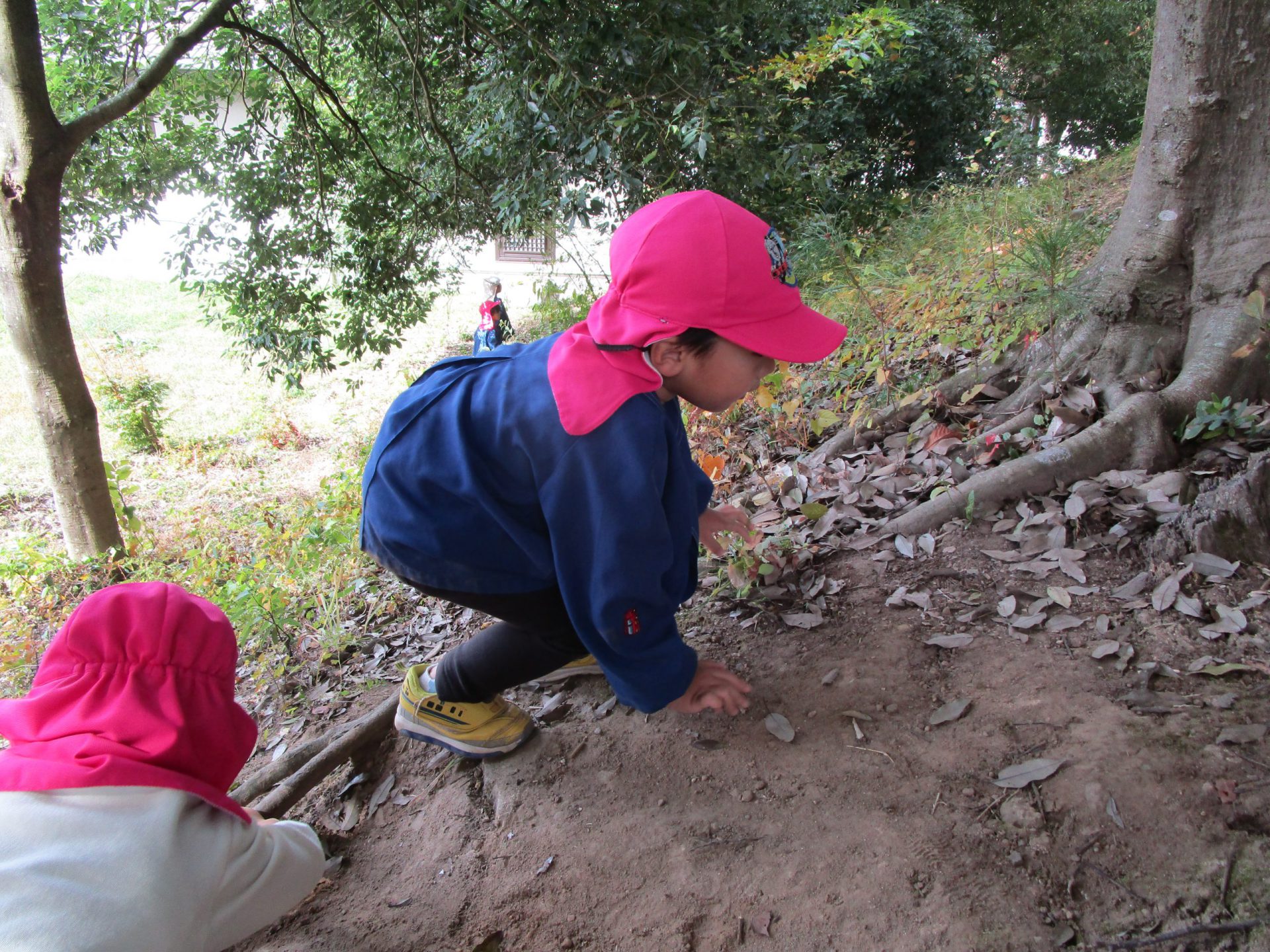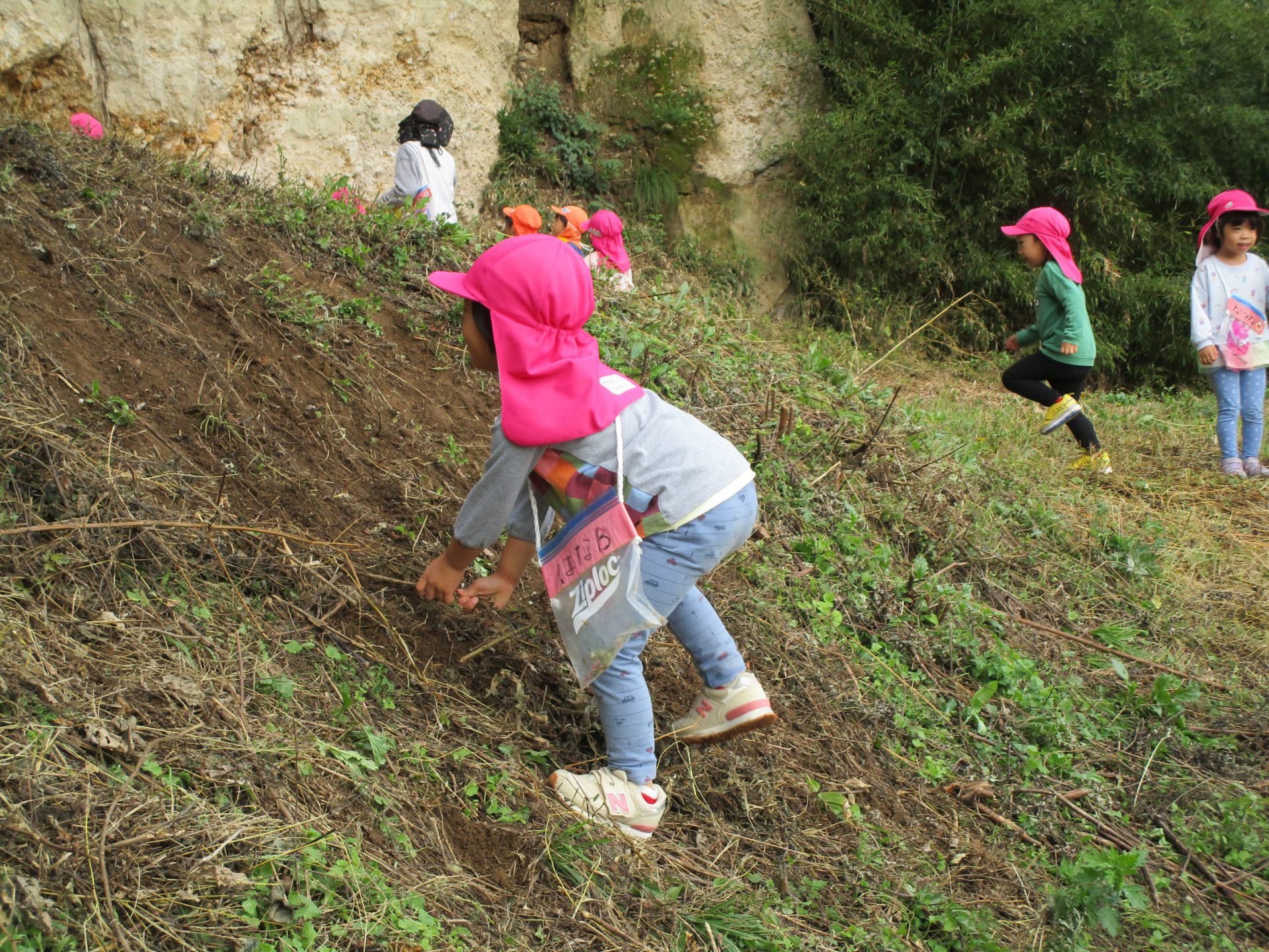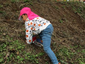 異年齢で散歩に行くことで、年少児だけでは行くことが難しい場所へ出かけることができたり、大きいクラスの子が小さいクラスの子へ遊び方や物の扱い方などを伝える機会を作ったりすることができると感じました。また大きいクラスの子がやっていることに対して「やってみたい」と感じ、遊びが広がっていく姿も多く見られました。
