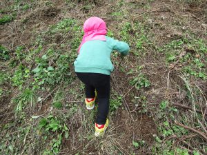 土手に向かって走っていく年長さんの様子を見てやってみたいと挑戦する年少さん。