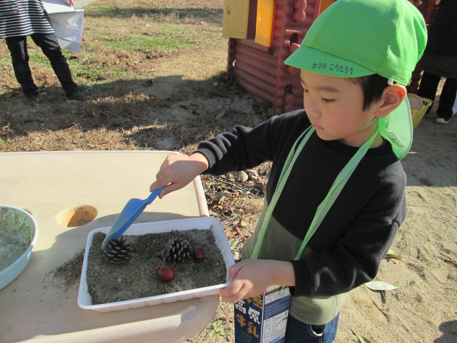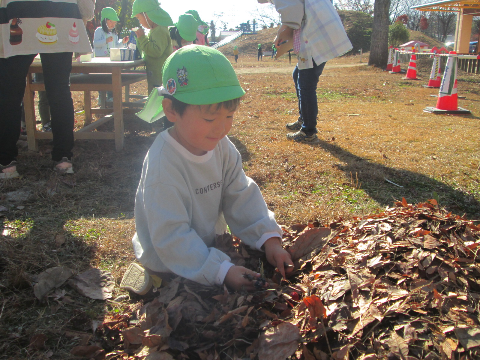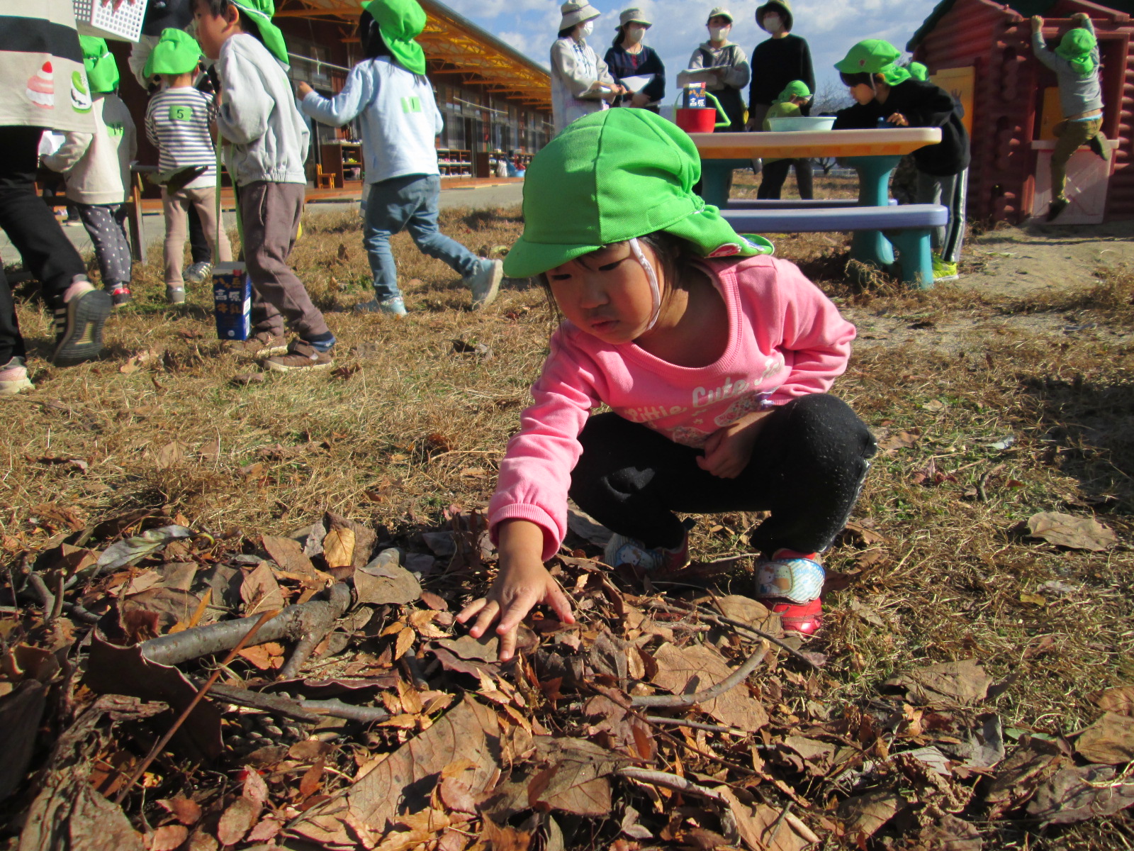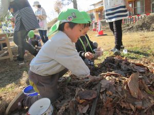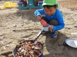 焚き火ごっこではたくさんの落ち葉に、どんぐりや松ぼっくりを入れて、焼き芋会に!