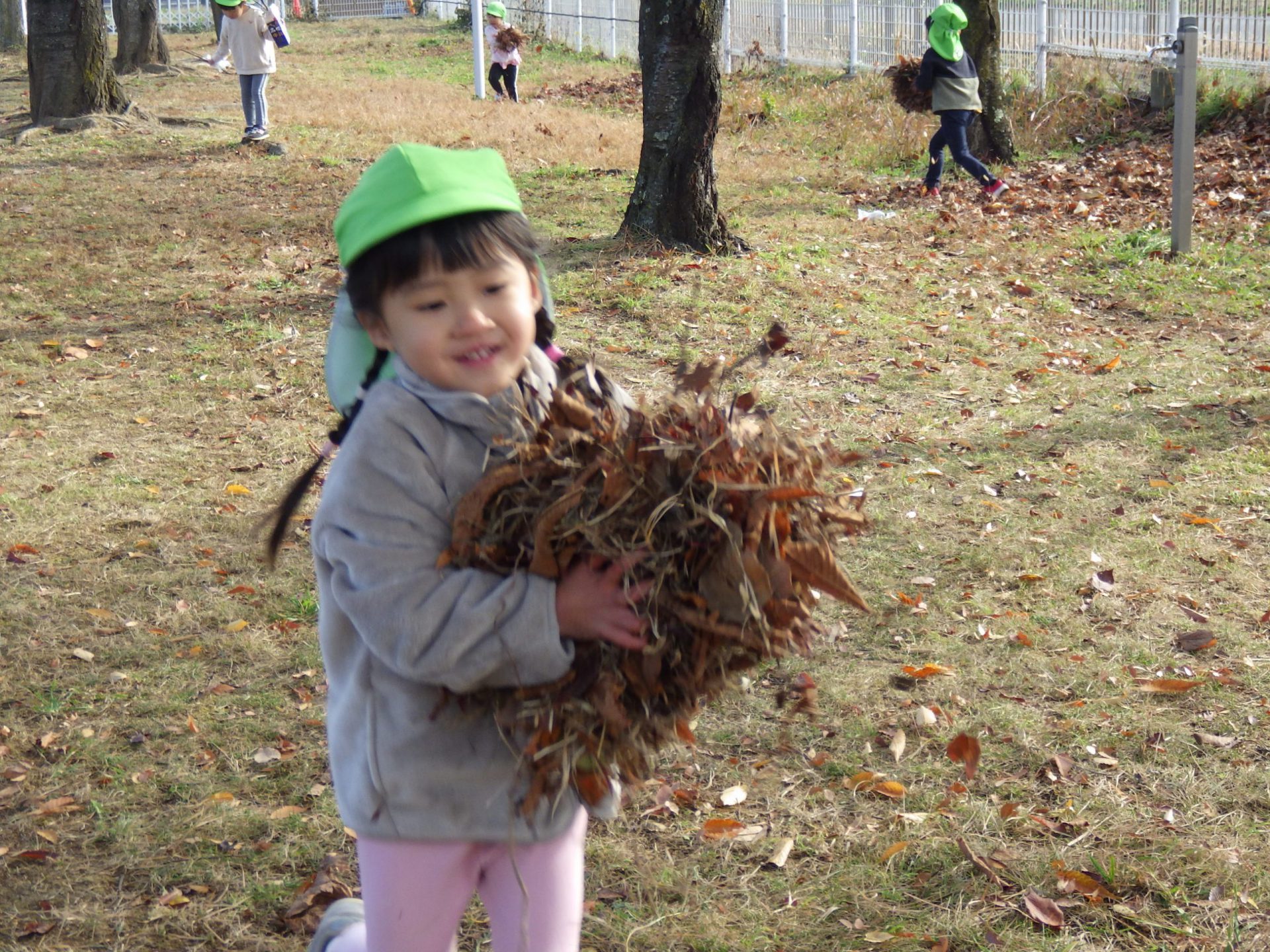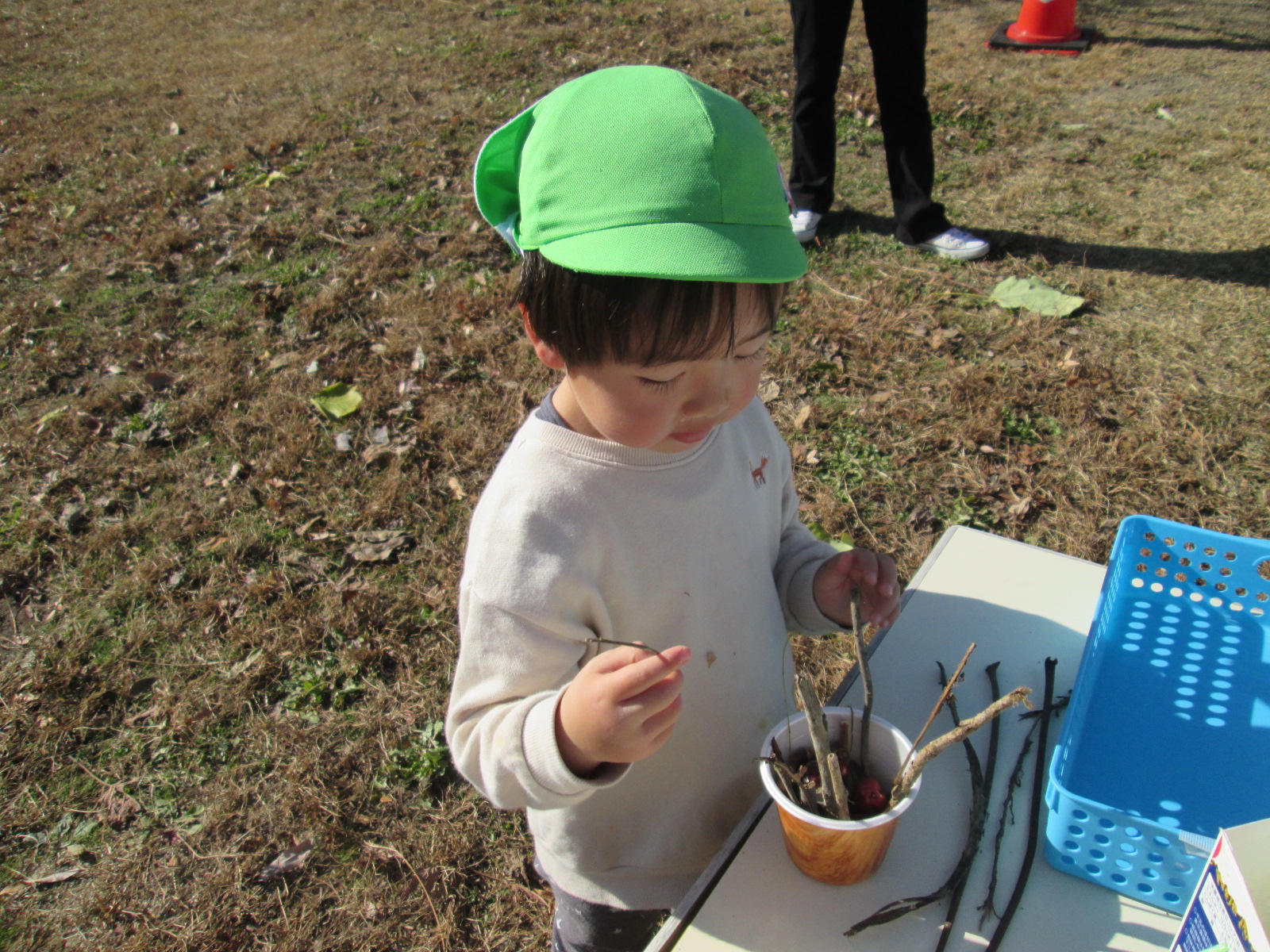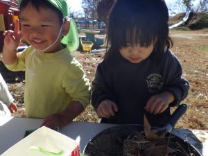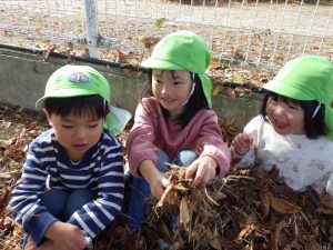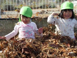 焚き火ごっこではたくさんの落ち葉に、どんぐりや松ぼっくりを入れて、焼き芋会に!