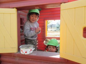 おままごとでは、お母さんやお父さんになりきり、「お仕事行ってきます〜」「ご飯できたよ〜」など会話を楽しんでいました。子どもたちは、お母さんやお父さんをよく見ていますね。