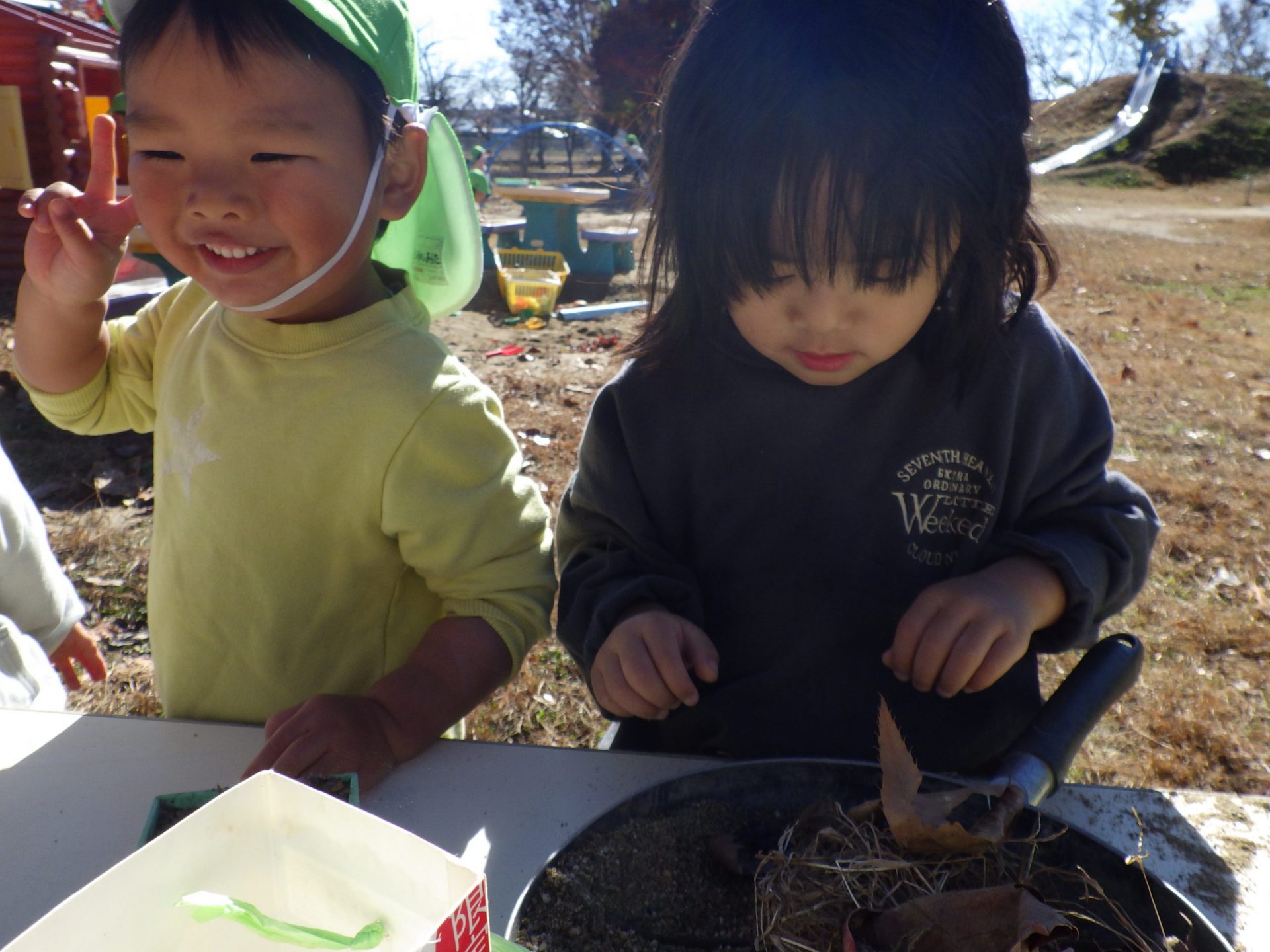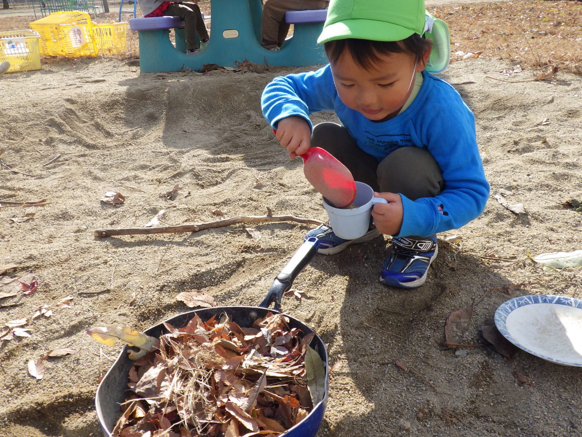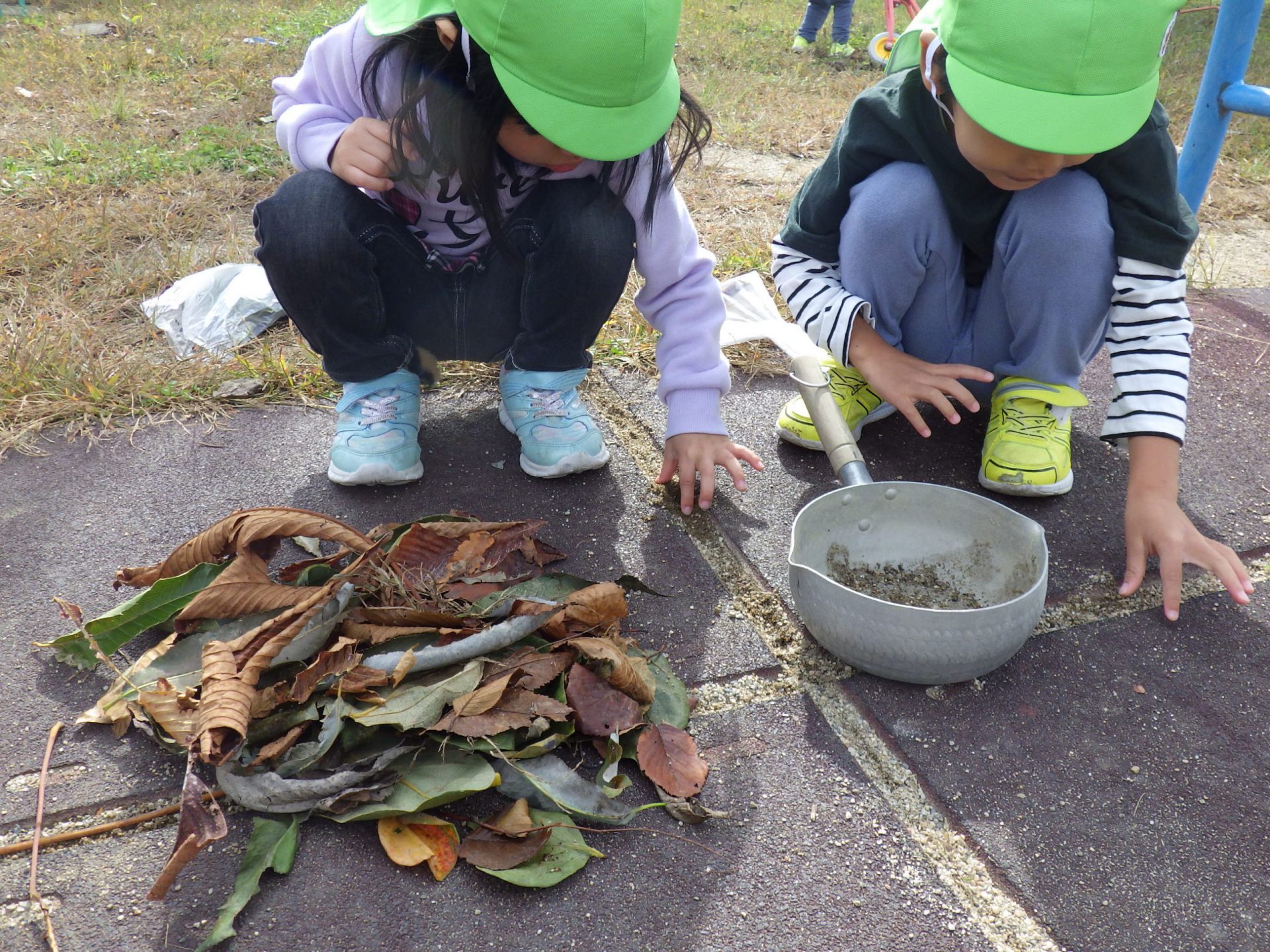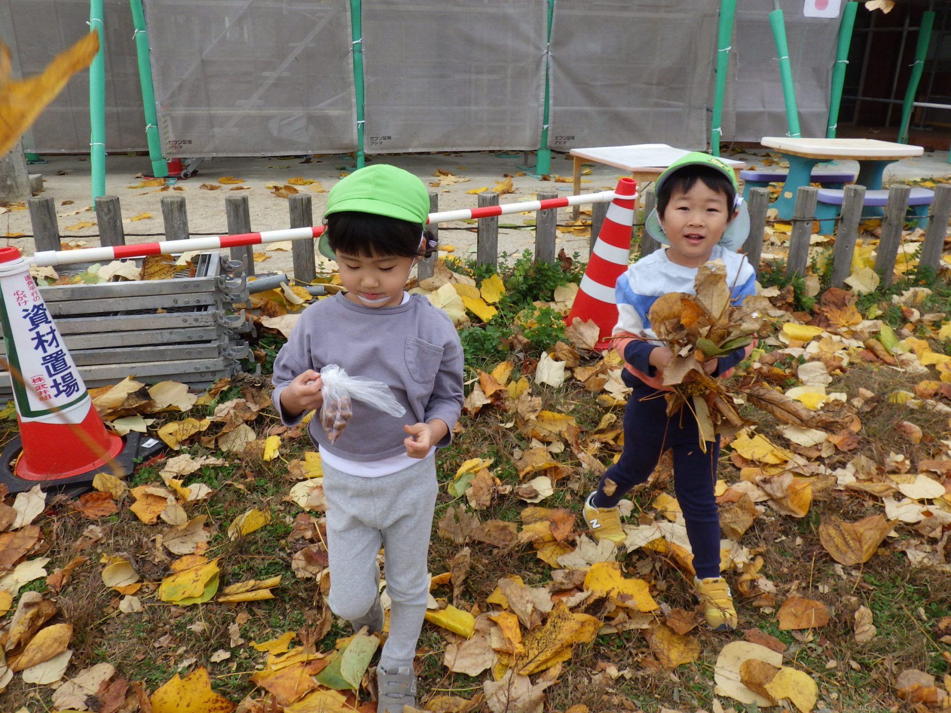 落ち葉の色や形の違いに気付き、違いを活かして遊びに取り入れていました。