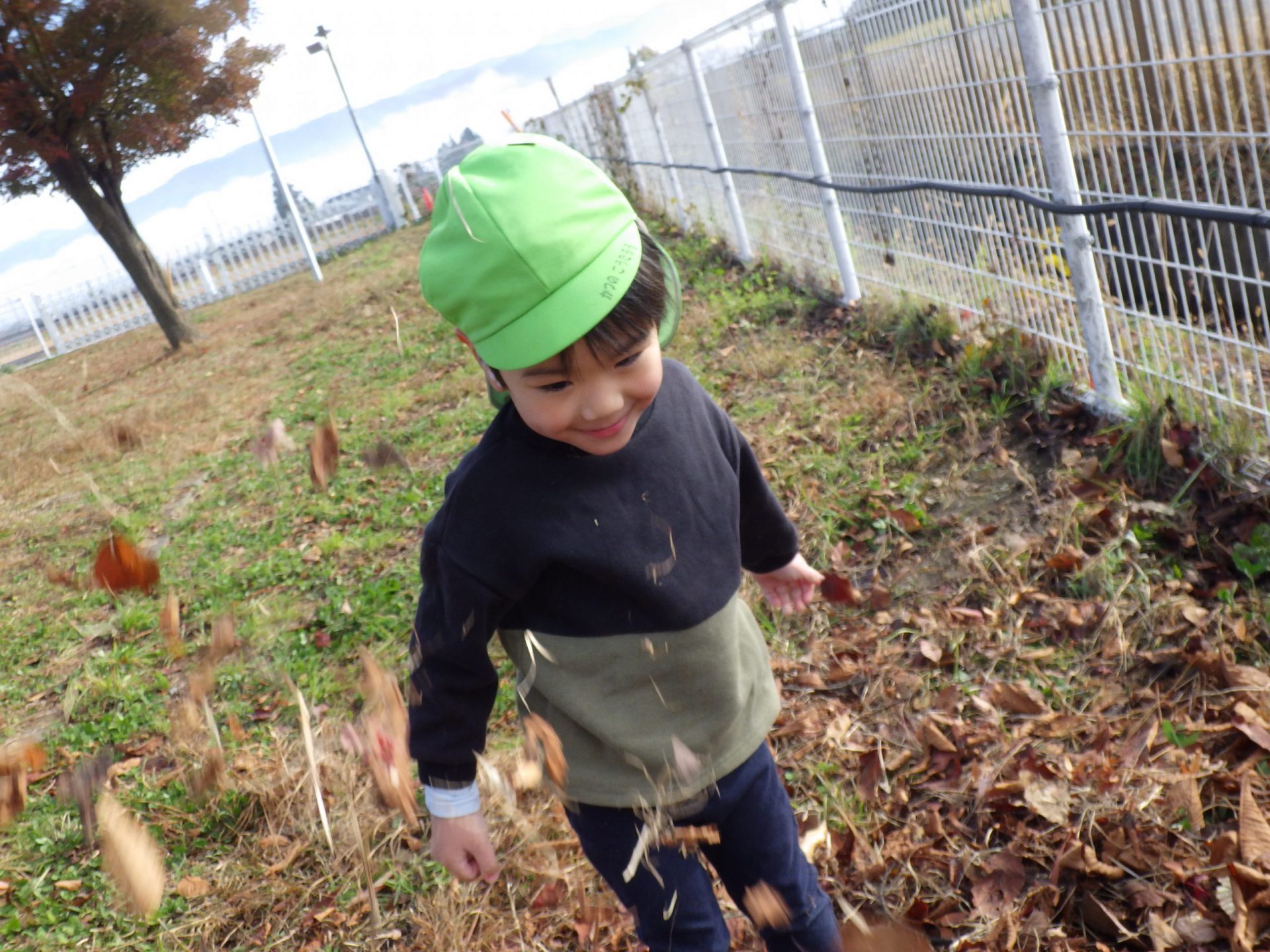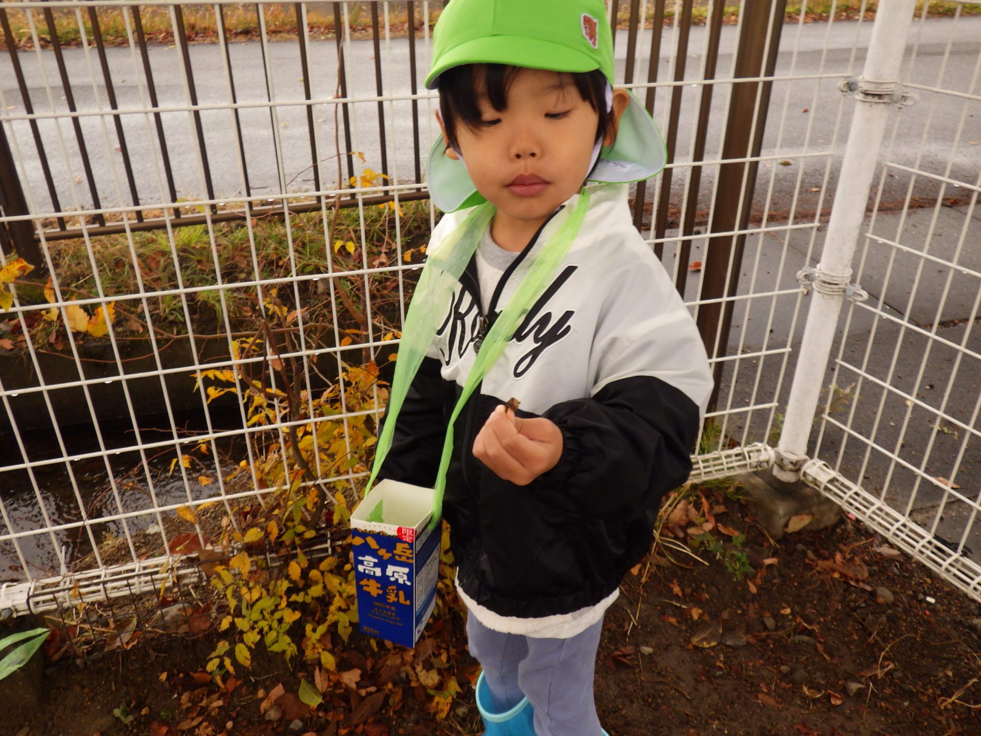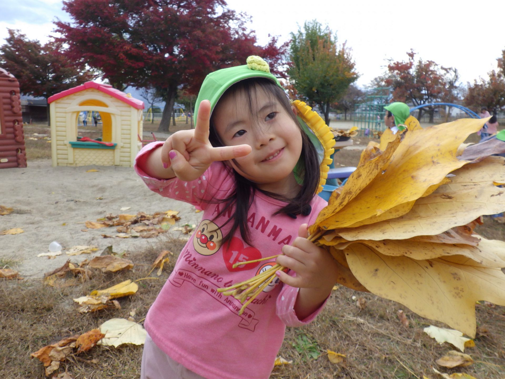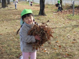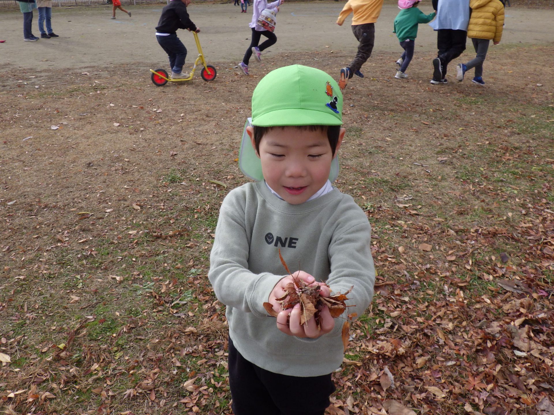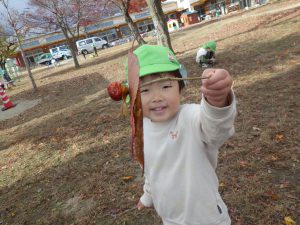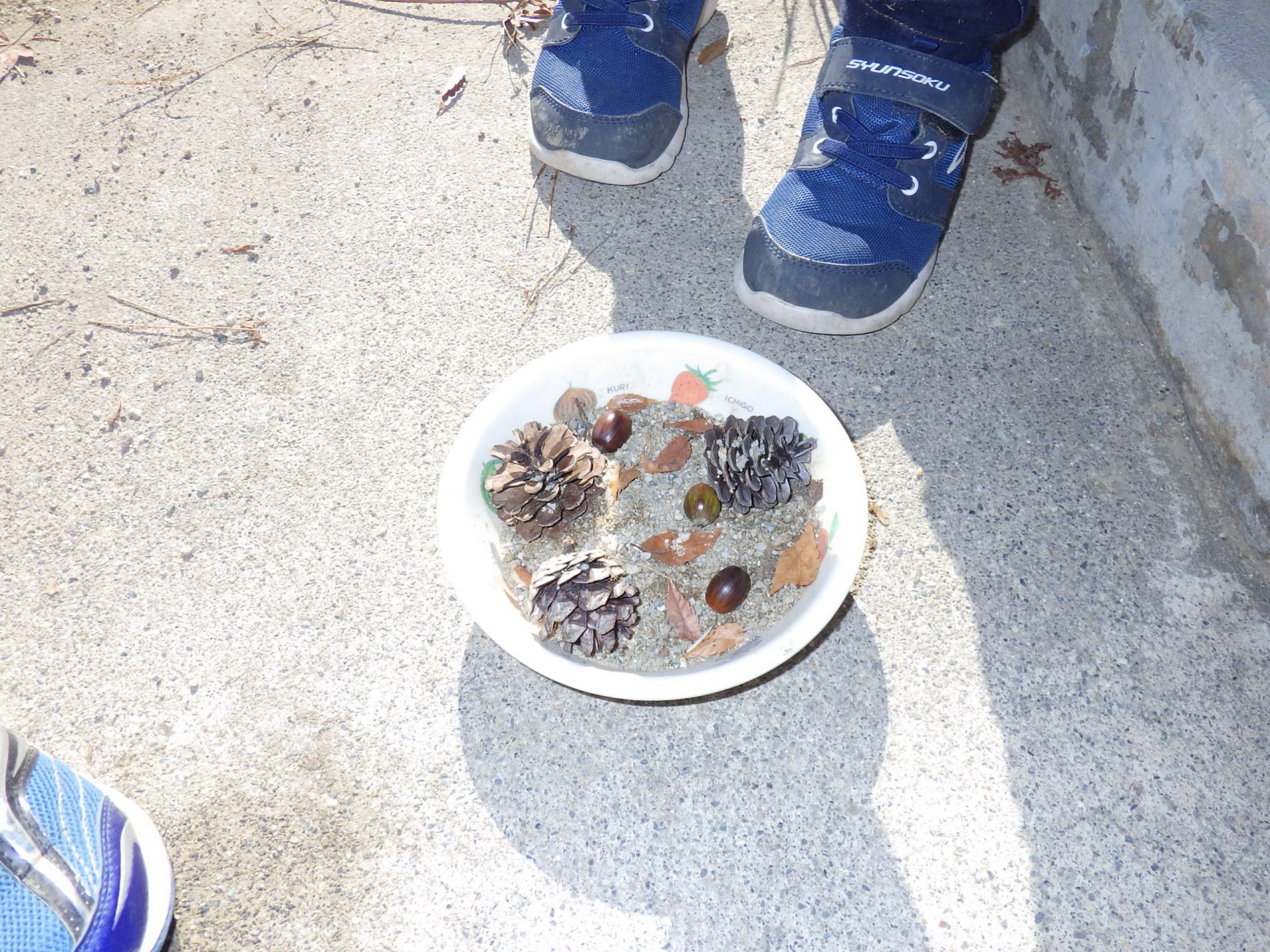 落ち葉、どんぐり、松ぼっくりなど、秋の自然物は子どもたちにとっては宝物です。この時期にしか出会えない宝物、たくさん集めて色々な遊びを楽しんでほしいなぁと思います。