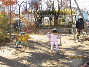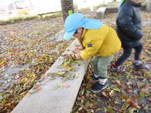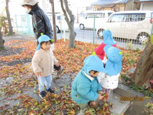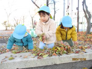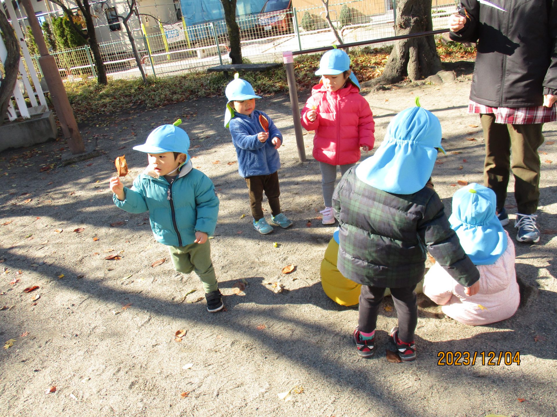 だんだん寒くなっていくにつれて、木の葉っぱの色が変わってきていることや、落ち葉が増えたことに気が付いた子どもたち。風が吹くと落ちてくる葉っぱをキャッチして遊んだこともありました。葉っぱに触れたり見たりする中で2歳児なりに、ゆっくり冬になっていく季節の移り変わりを感じることができたと思います。