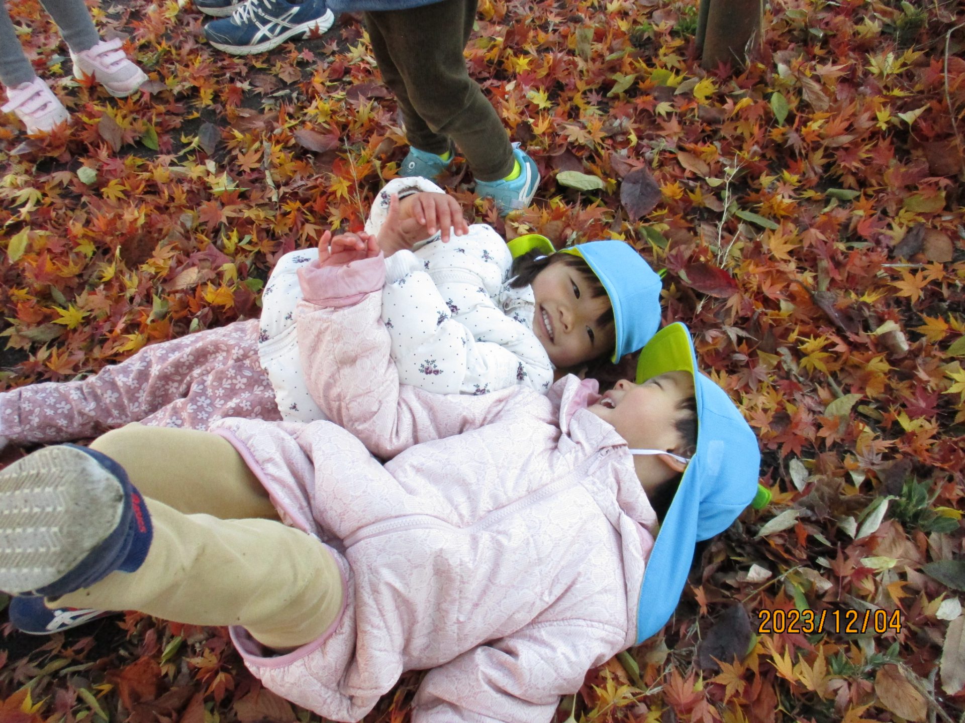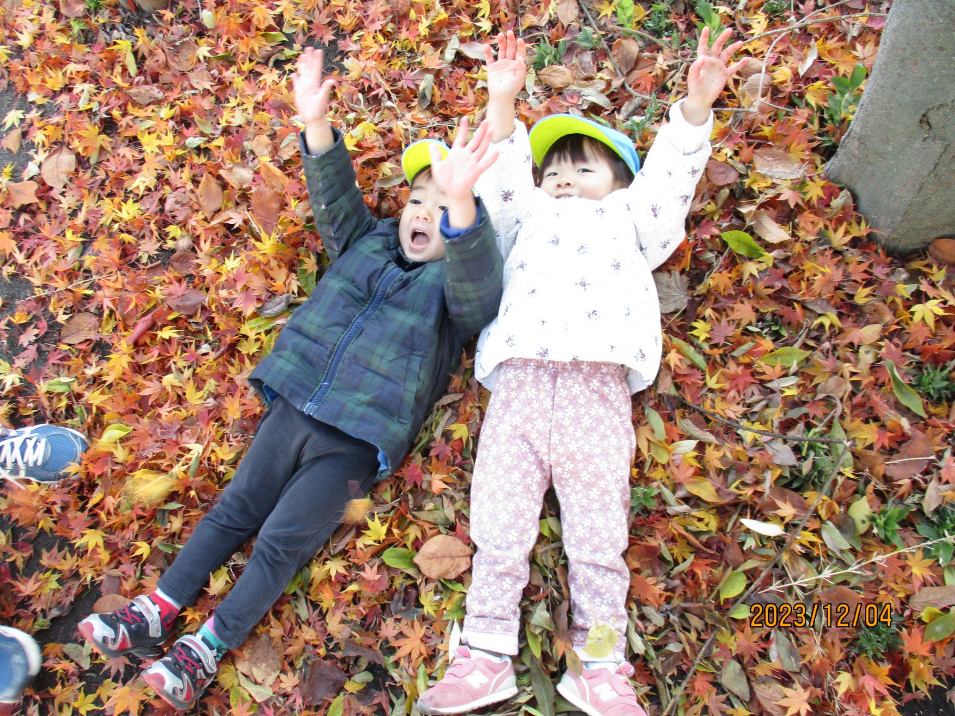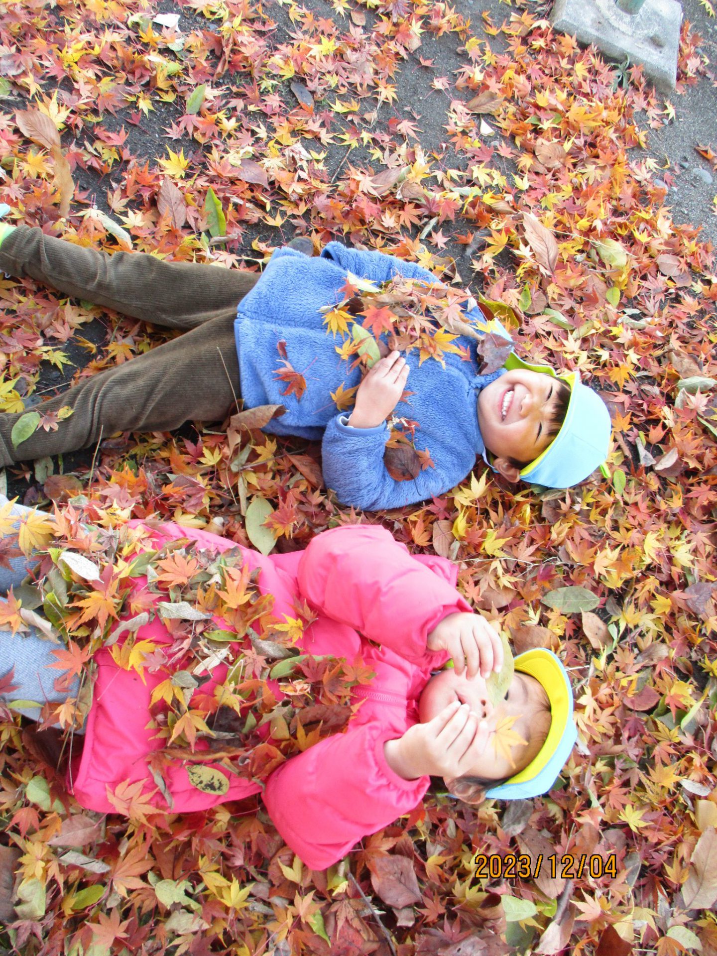 今まで、体をダイナミックに使って遊んできた経験があったからこそ、落ち葉に寝転び、体全体で葉っぱを感じる姿に繋がったと思います。今後も子どもの「たのしい!」を大事に保育をしていきたいと思います。