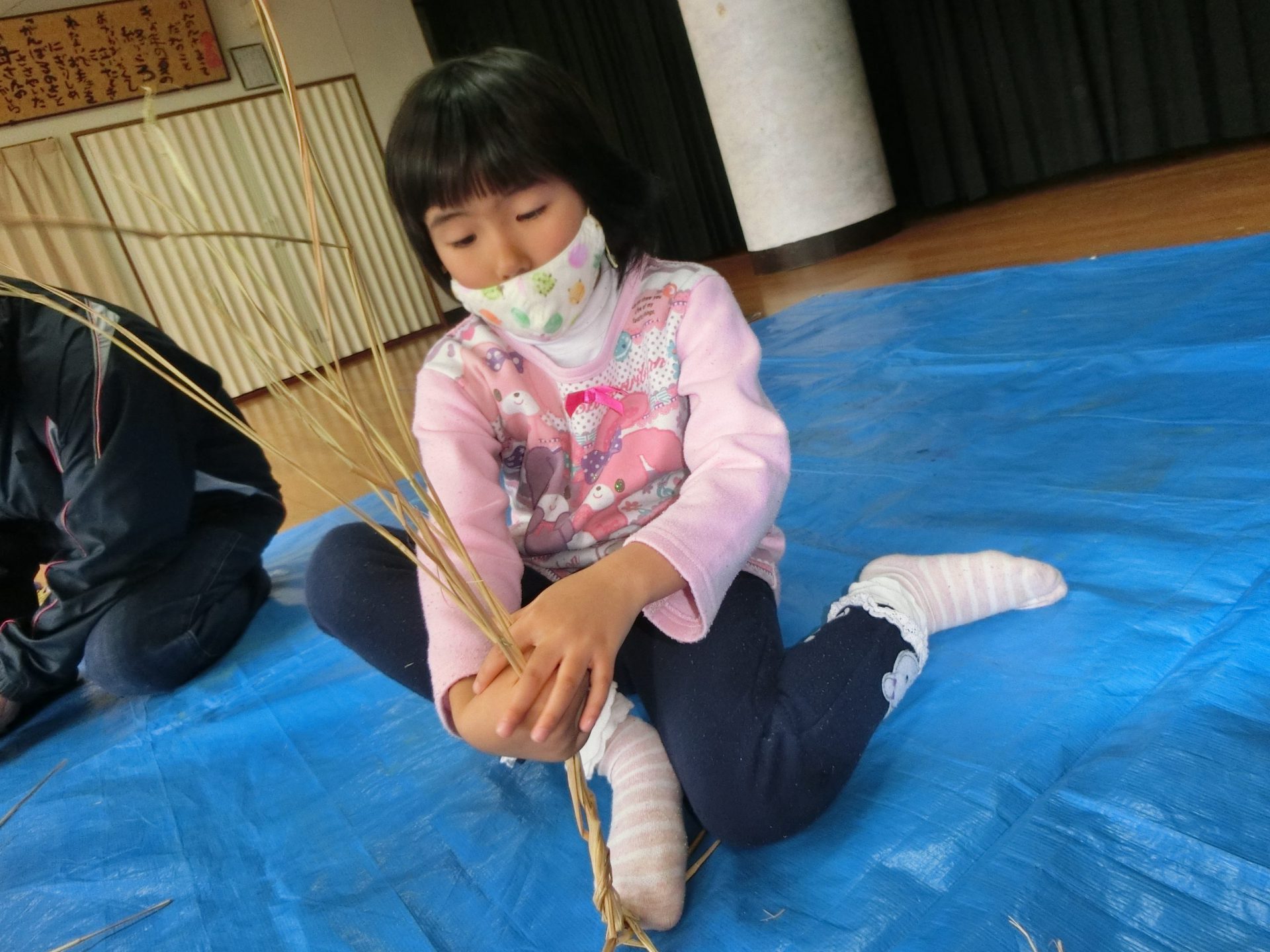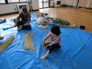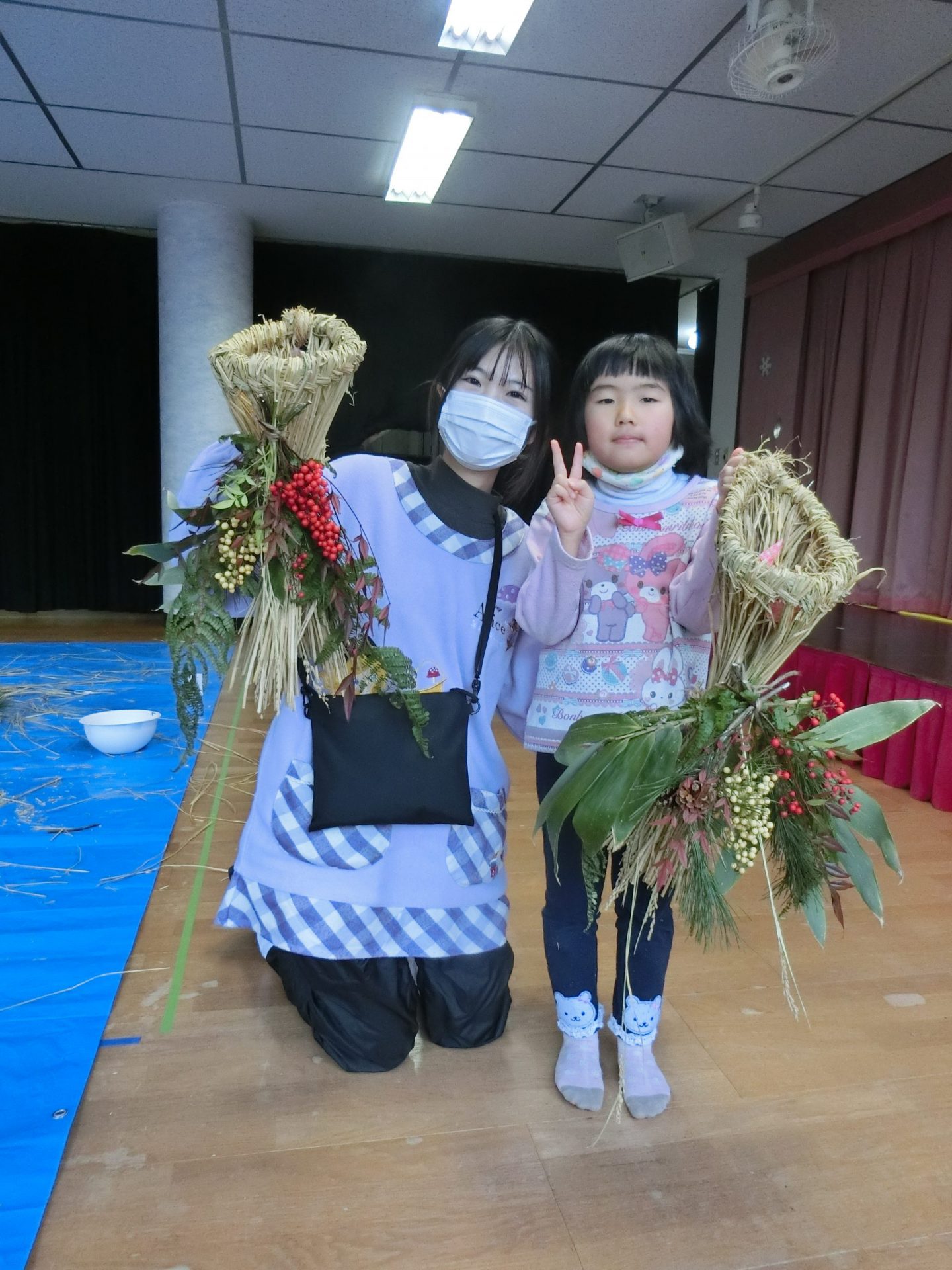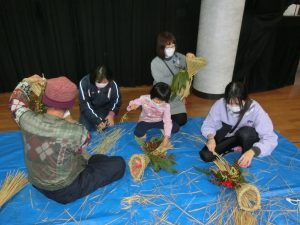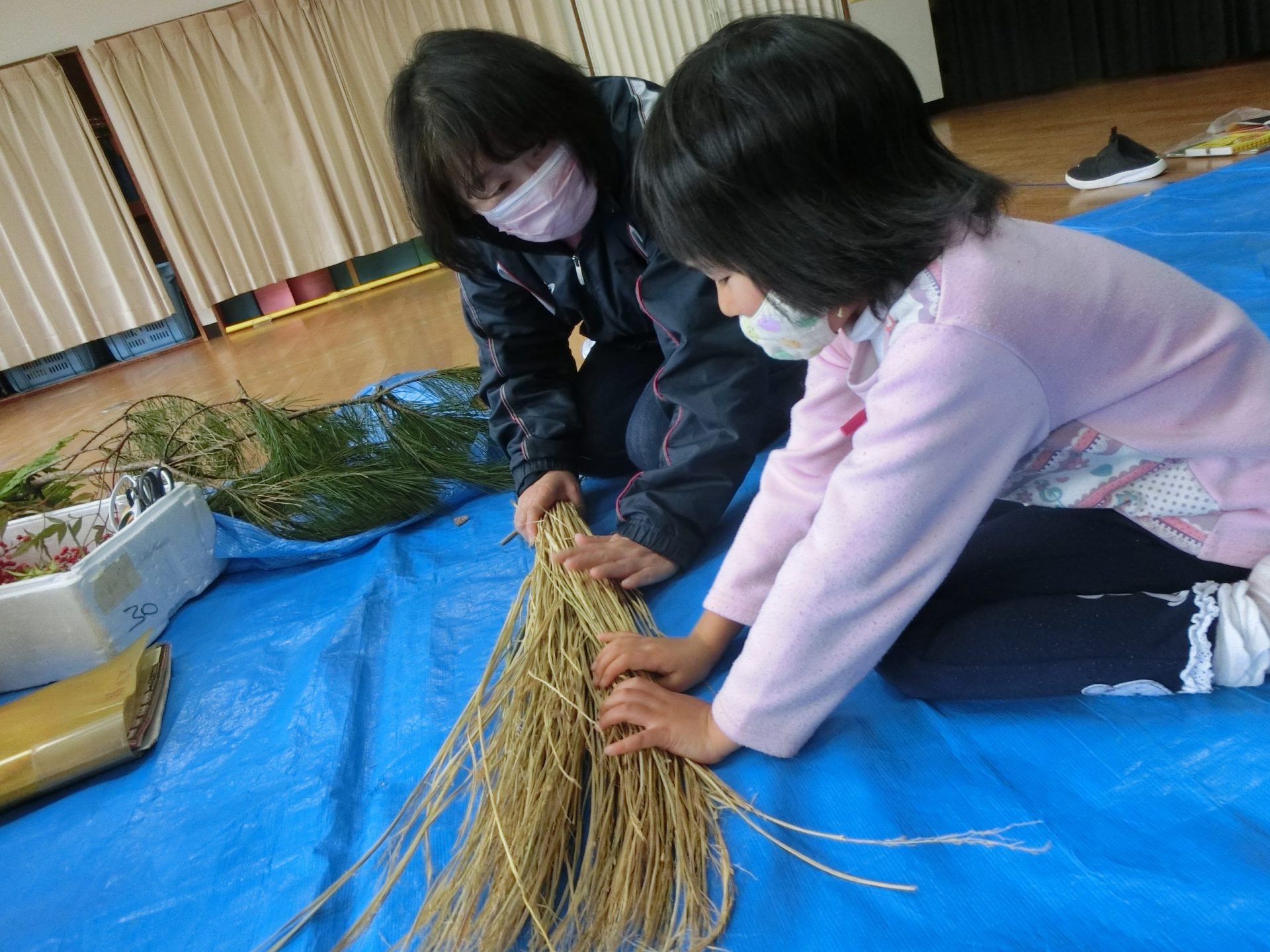 制作が好きな年長さん、しめ縄作りも興味津々で取り組んでいました。保育士も夢中になって、一緒に作りました。うまくいかないなぁと思うところもありましたが、出来上がってみると、それぞれが味わい深い出来上がりになりました。制作が終わってから、敬造さんが「大人が面白がらないと、子どもが面白いわけがない」と言われました。その言葉を実感できる、子どもも大人も楽しい経験になりました。敬造さんありがとうございました!