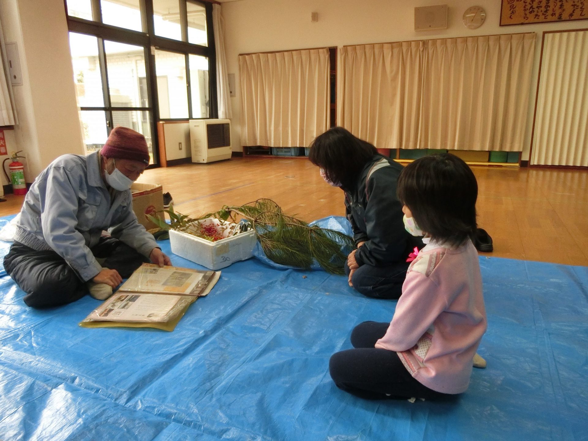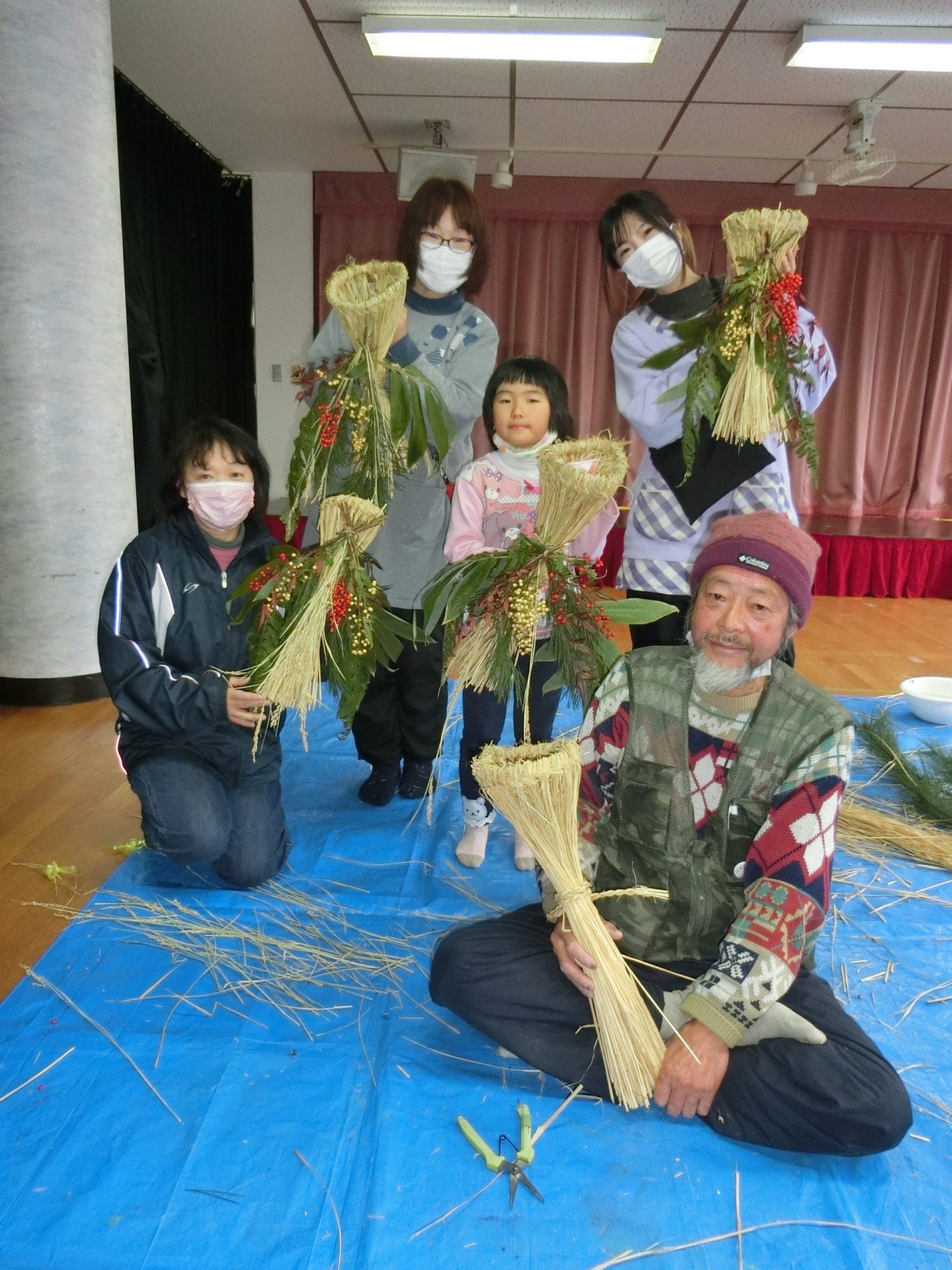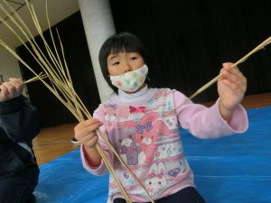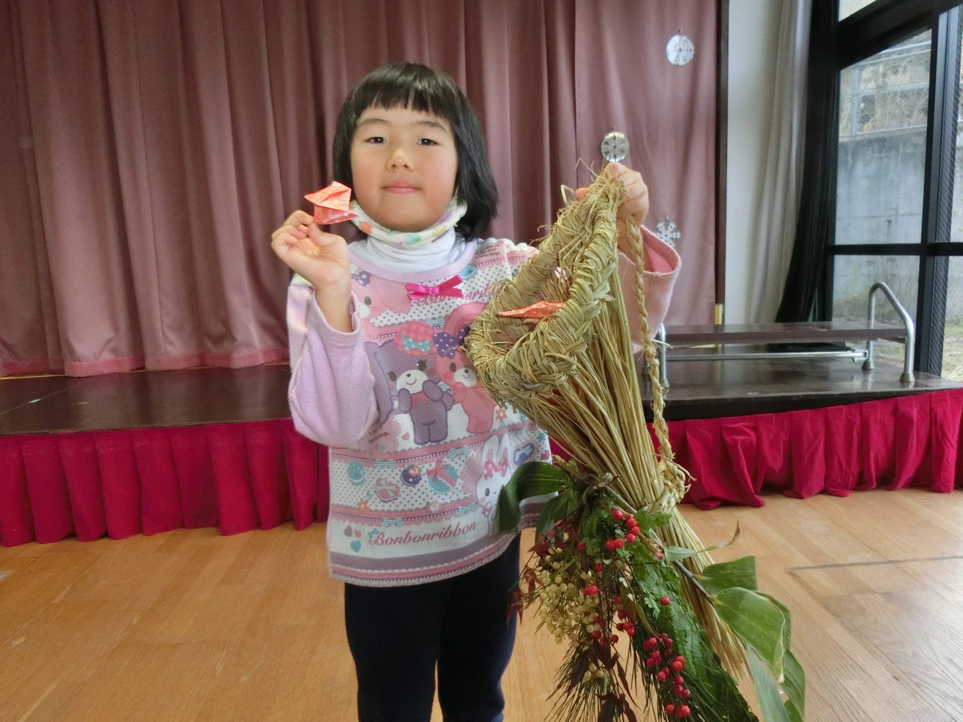 制作が好きな年長さん、しめ縄作りも興味津々で取り組んでいました。保育士も夢中になって、一緒に作りました。うまくいかないなぁと思うところもありましたが、出来上がってみると、それぞれが味わい深い出来上がりになりました。制作が終わってから、敬造さんが「大人が面白がらないと、子どもが面白いわけがない」と言われました。その言葉を実感できる、子どもも大人も楽しい経験になりました。敬造さんありがとうございました!